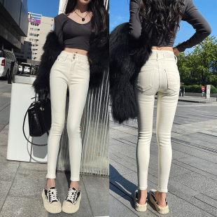 九分烟管直筒裤 xmier米白色加绒高腰牛仔裤 女合集紧身显瘦铅笔裤