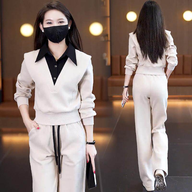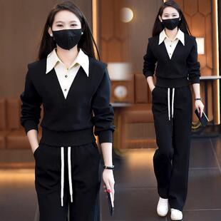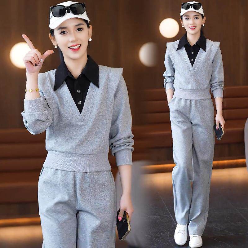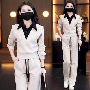 休闲运动跑步两件套裤 Polo领假两件拼接卫衣女阔腿裤 2026春秋新款