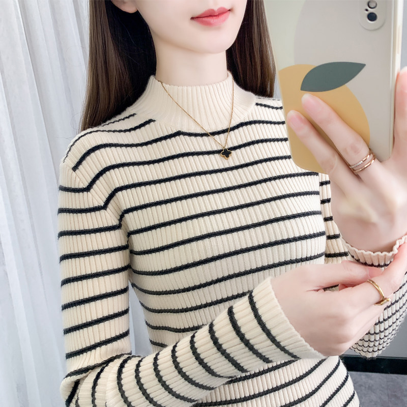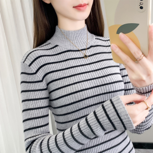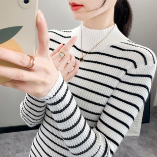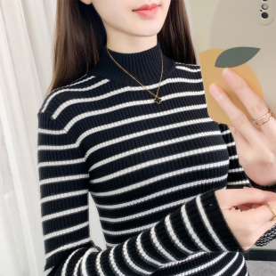 女早春2025新款 薄款 条纹针织衫 内搭修身 毛衣 上衣长袖 半高领打底衫