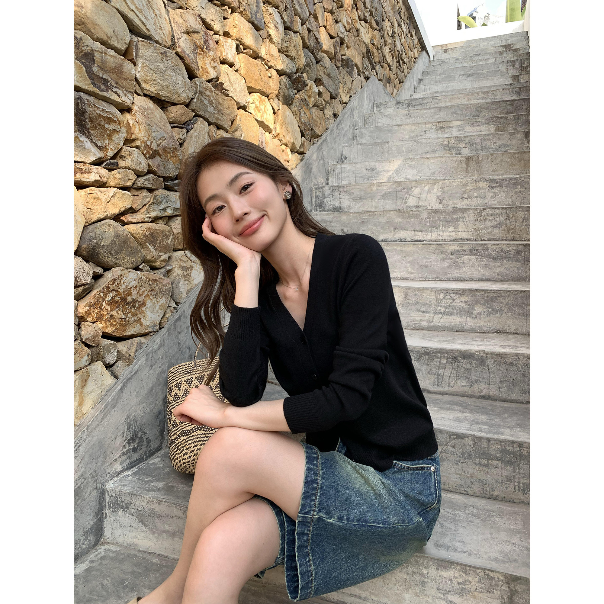 自由旅人 长袖 白色v领针织开衫 修身 上衣 女简约气质短款 pusumede