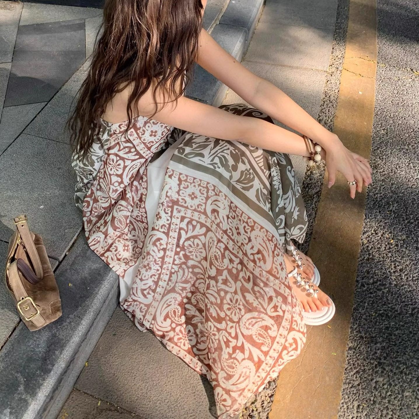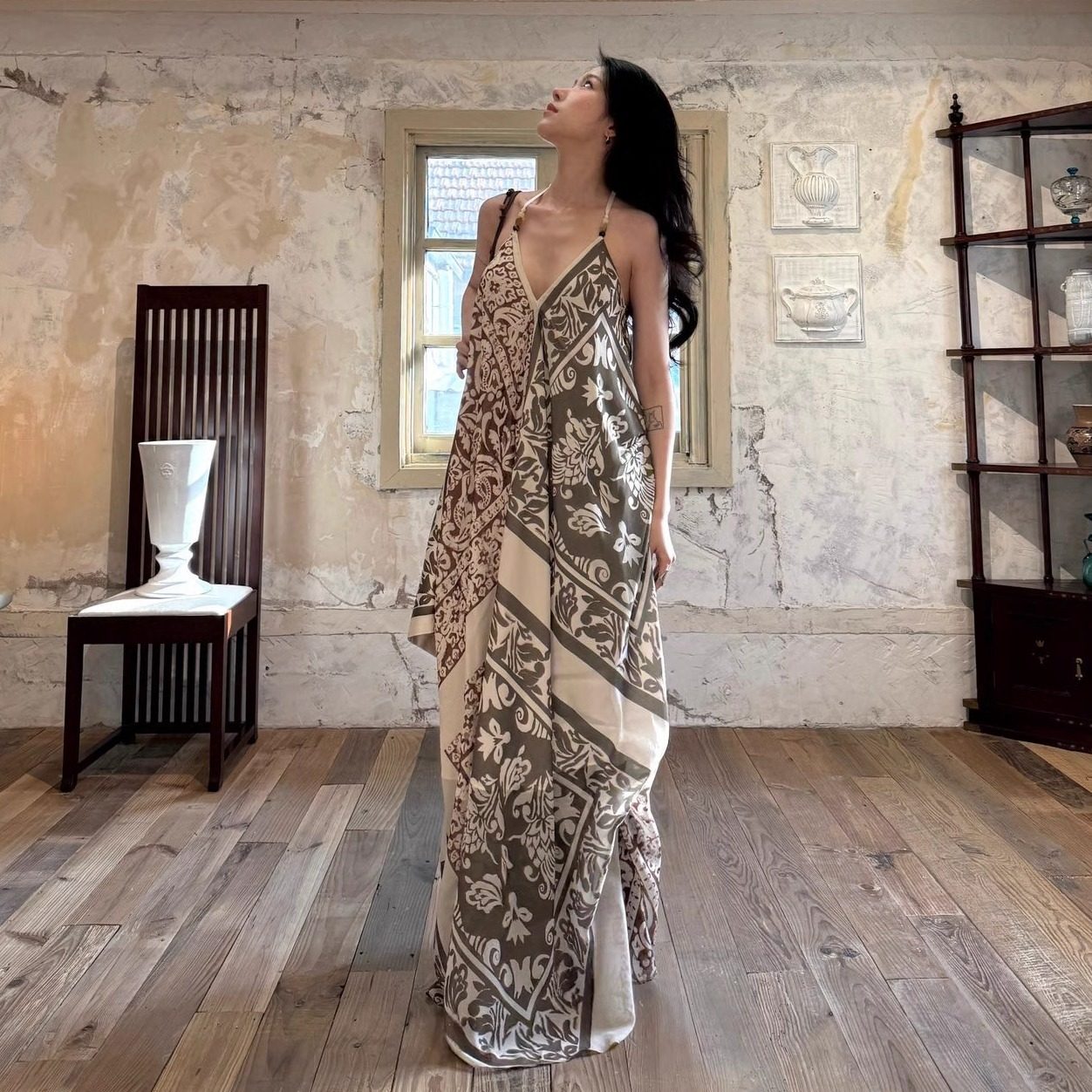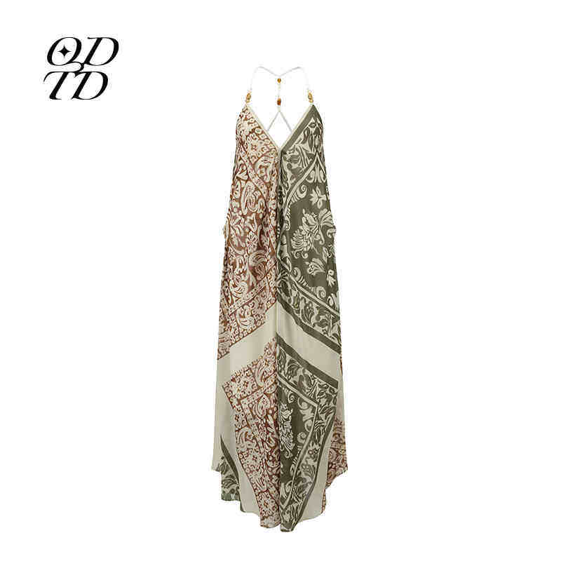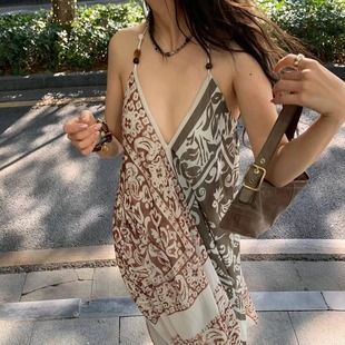 V领艺术印花撞色串珠吊带连衣裙波西米亚度假 25ss 热巴同款 ODTD