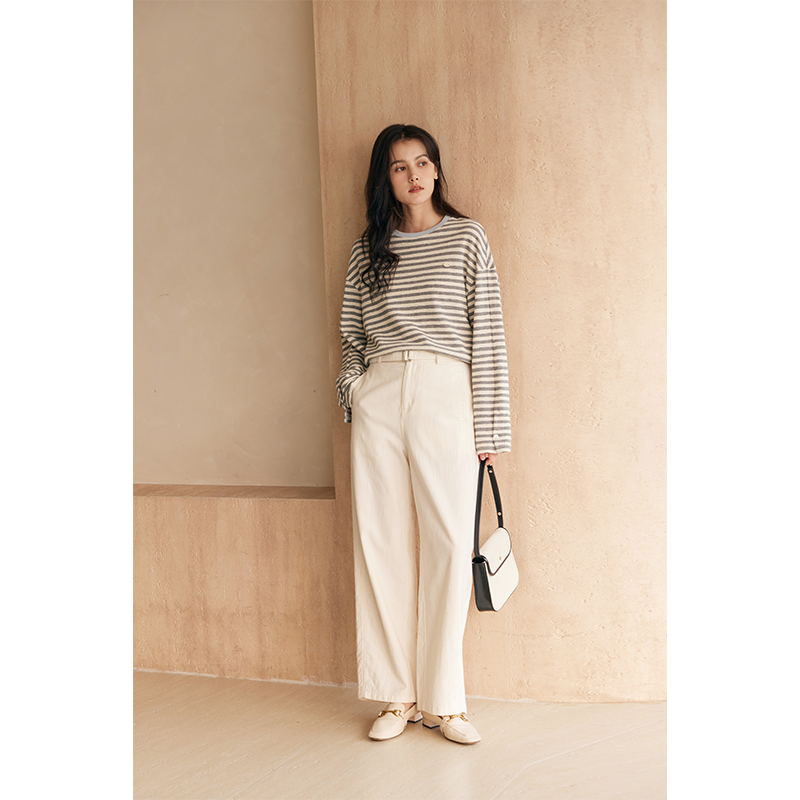 长袖 宽松休闲打底衫 内搭上衣 法式 HeyDress撞色领条纹T恤女秋季