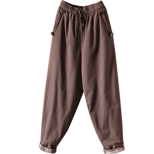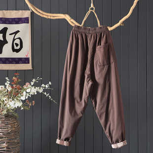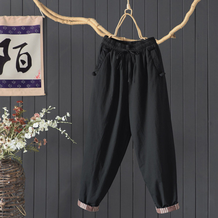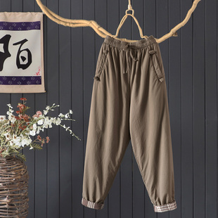 可翻边系带纯色女士棉裤 2024年冬宽松文艺夹棉加厚哈伦裤 全棉长裤