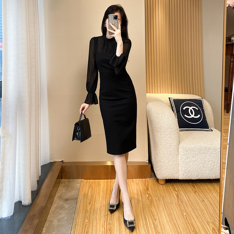 内搭修身 黑色气质连衣裙女春秋包臀气质中长款 裙子 长袖 高级感法式