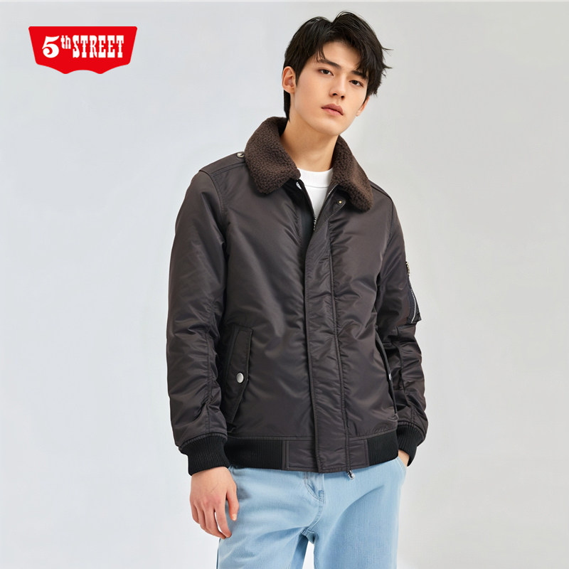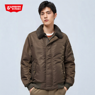 V37美式 加厚保暖防寒夹克外套 潮牌深灰色毛领立领连帽棉衣男冬季