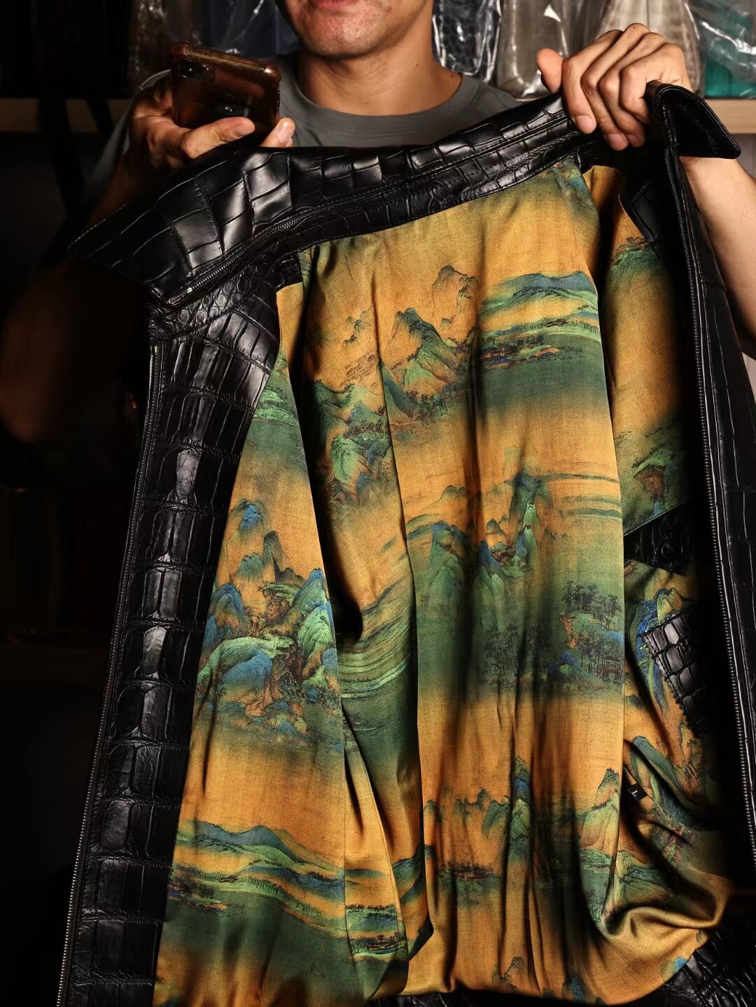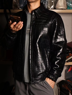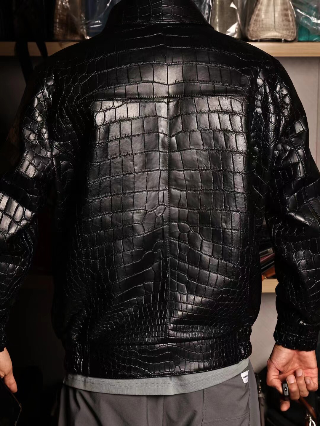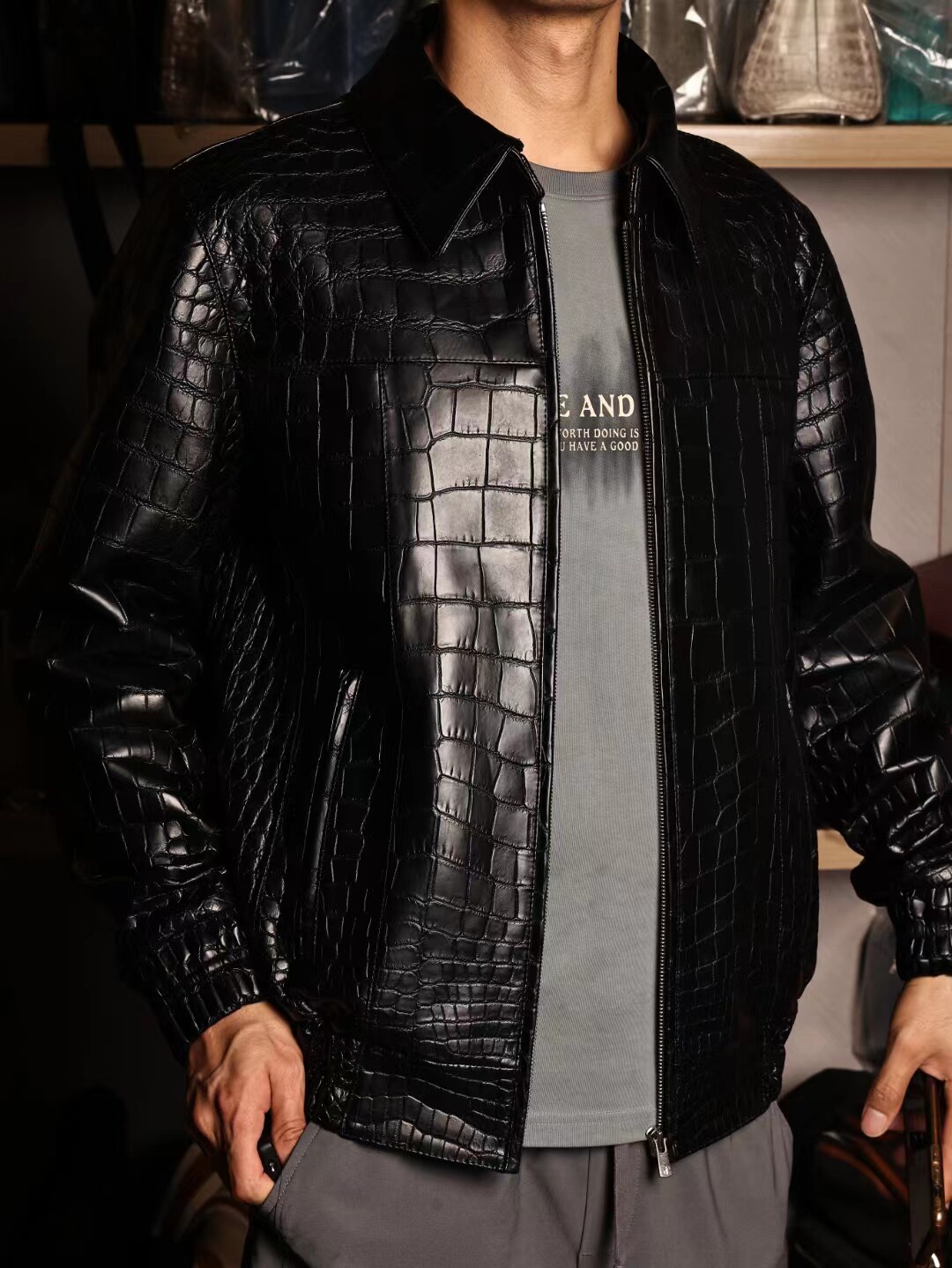 私人定制进口水染南非尼罗鳄休闲皮衣男士 翻领真皮夹克 鳄鱼皮短款