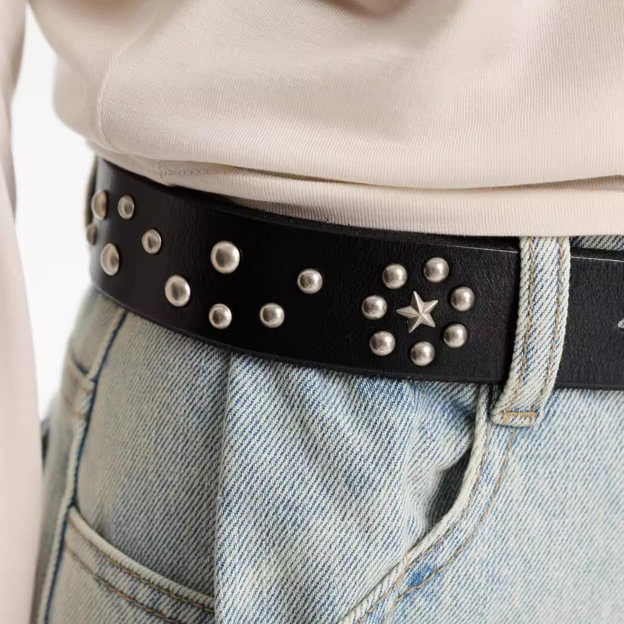 Three 黑色头层牛皮铆钉真皮皮带 Quarters25SS