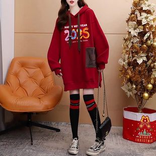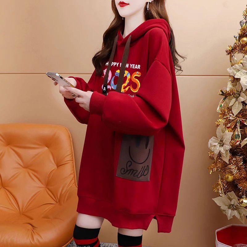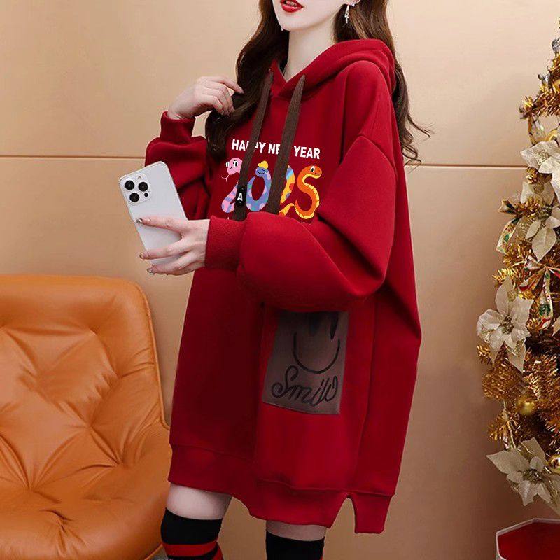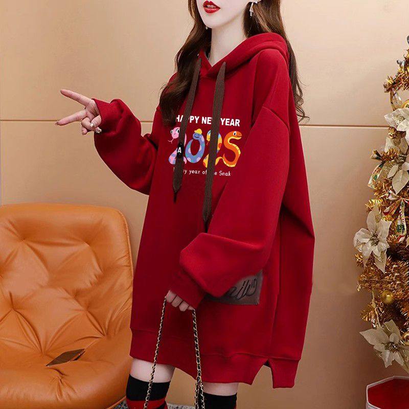 2025蛇年本命年红色女装 遮屁股连帽过年喜庆上衣服 加绒卫衣中长款