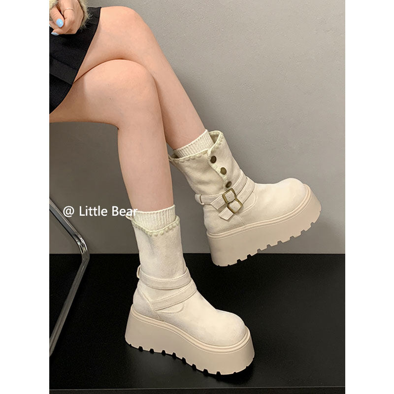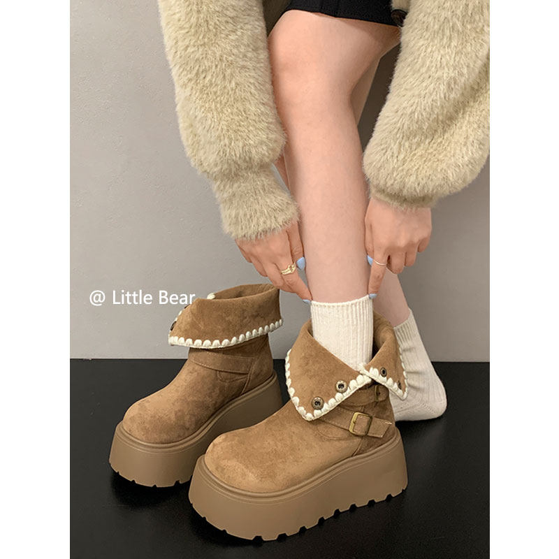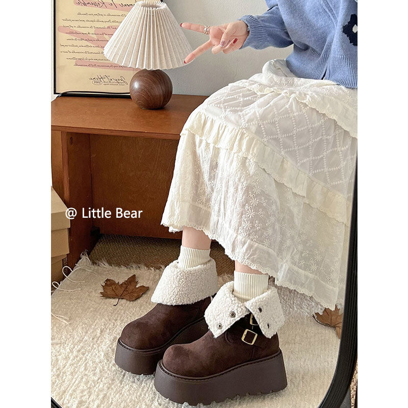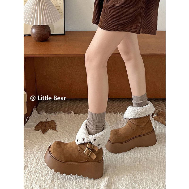 小熊出走增高厚底两穿勃肯马丁靴雪地靴女加绒保暖中筒白色棉靴