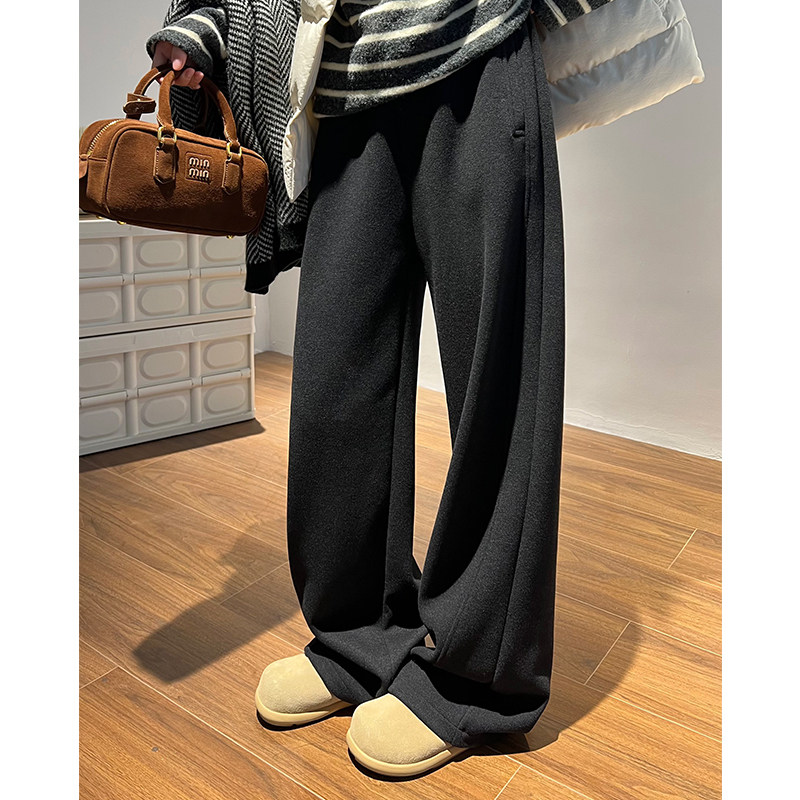 毛呢糯米裤 秋冬高腰垂感羊毛直筒裤 子 女2024新款 黑灰色加绒阔腿裤