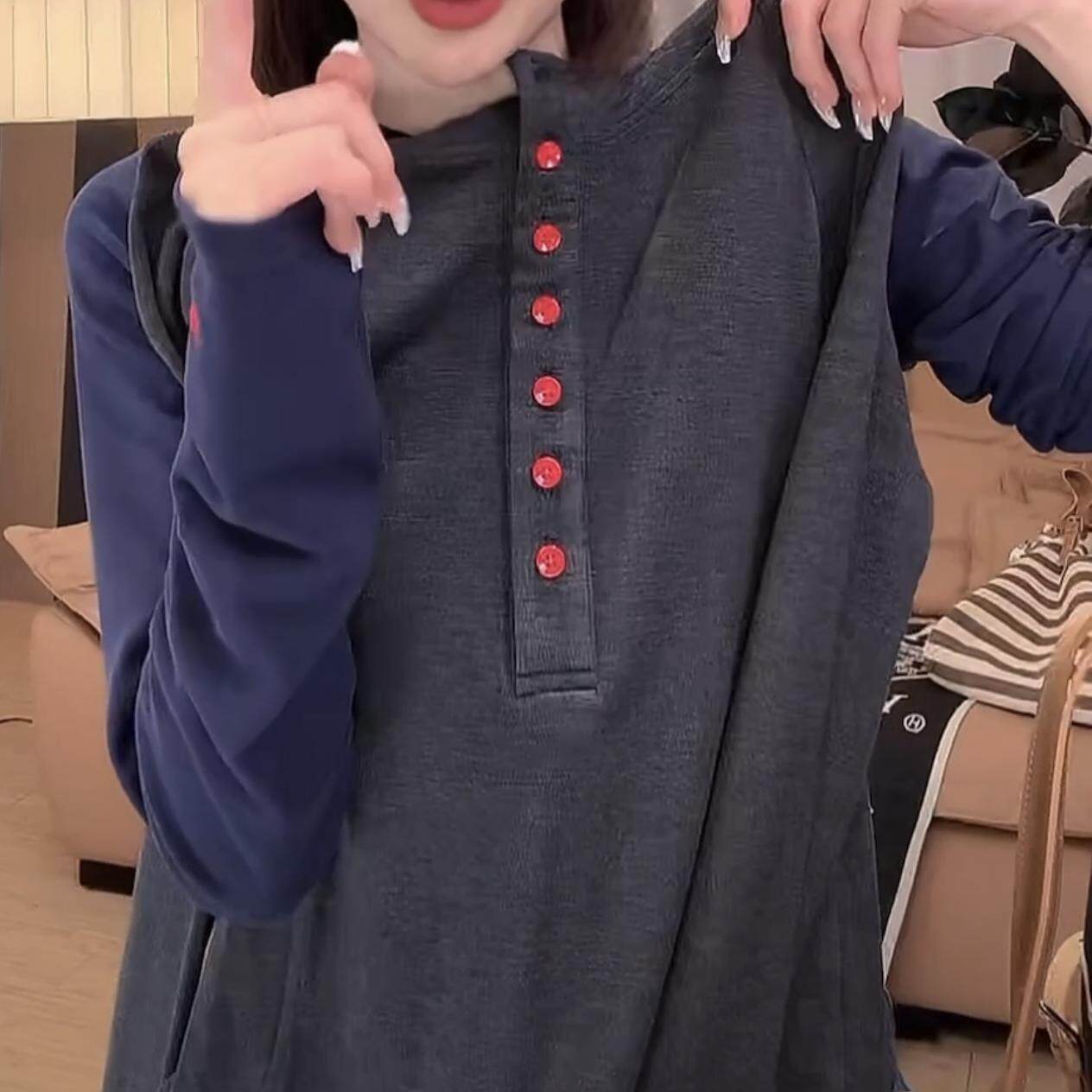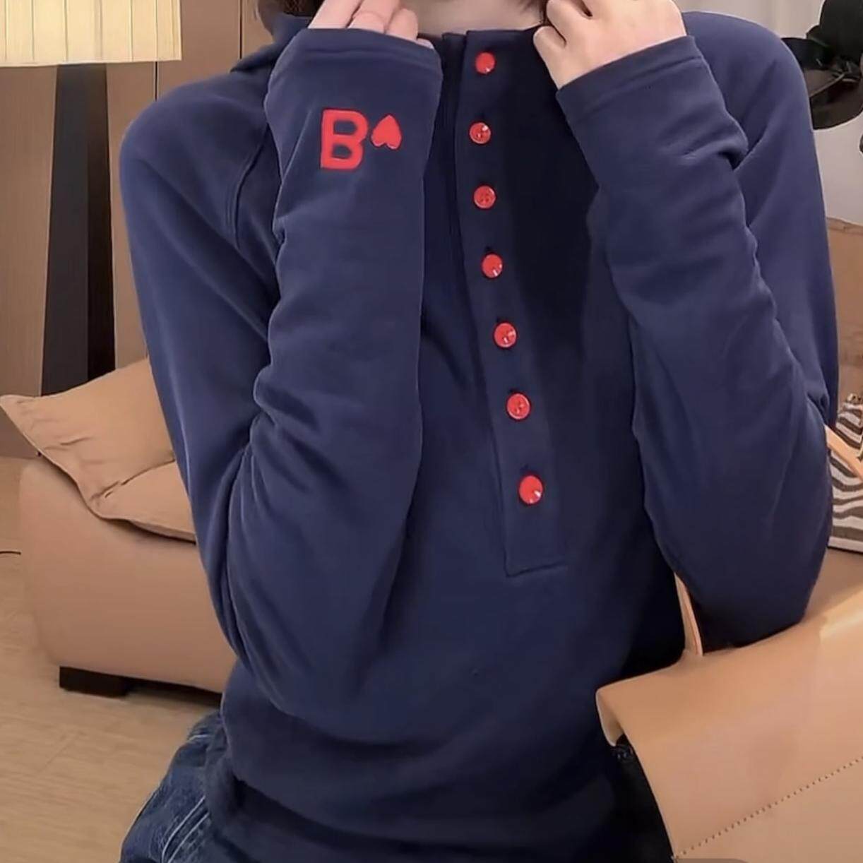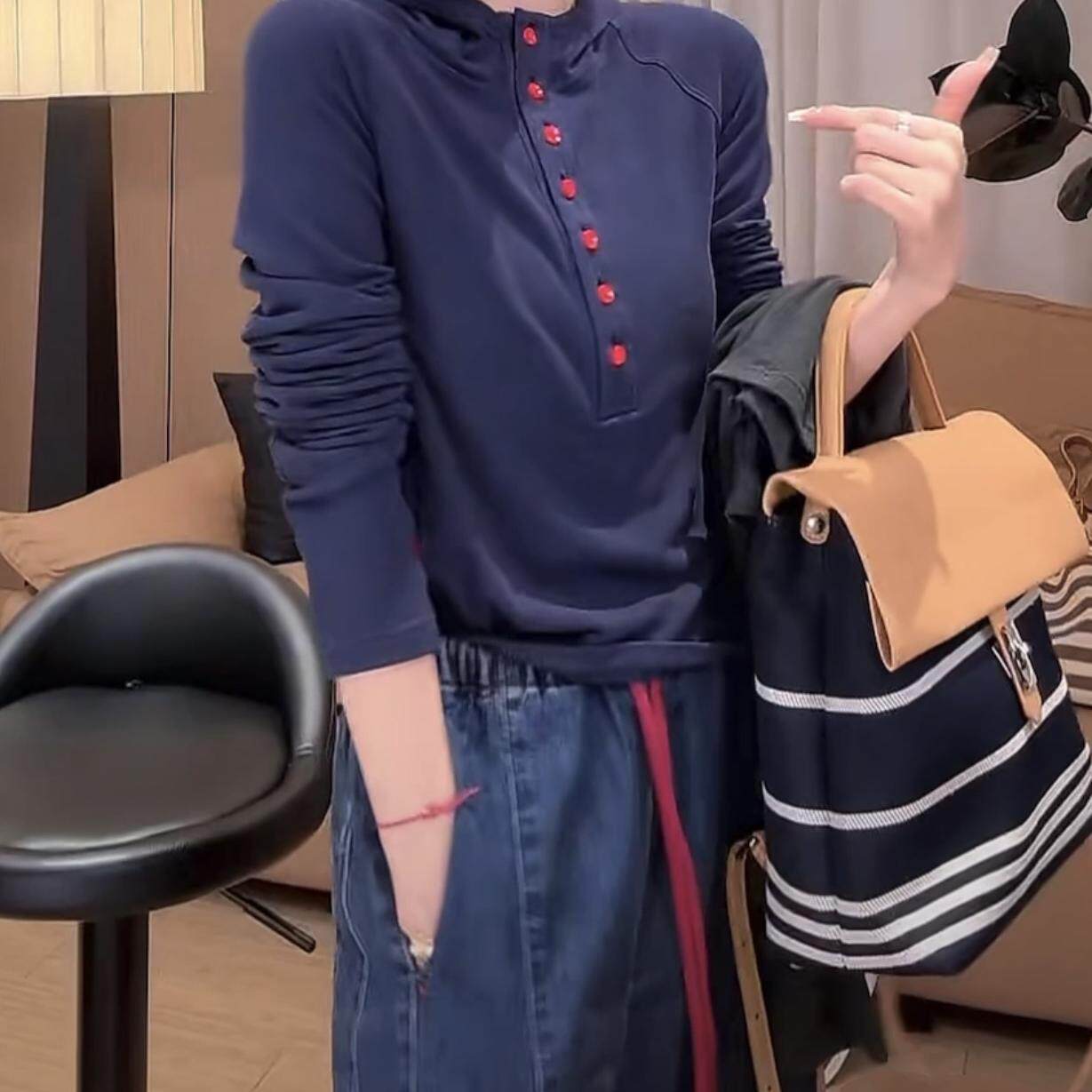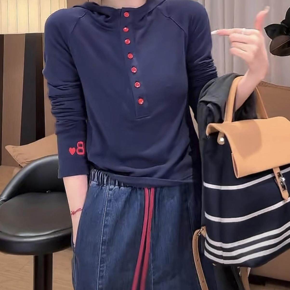 休闲百搭显瘦字母刺绣打底衫 T恤女时尚 连帽排扣长袖 2026春秋新款