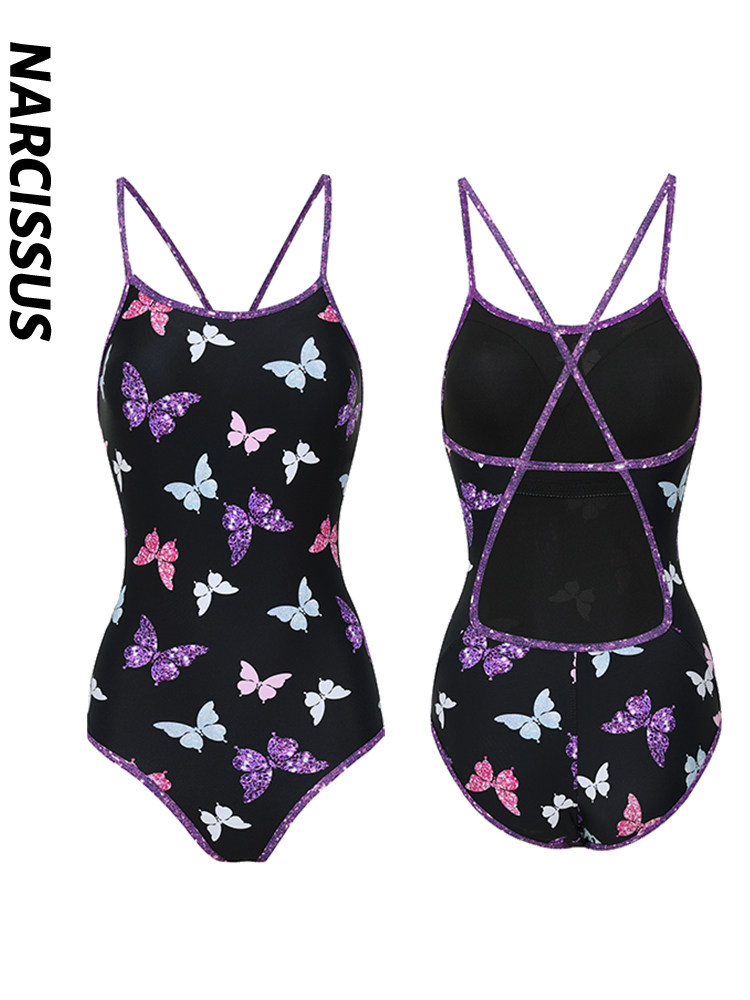 水仙SWIM暗夜闪蝶游泳吊带连体女士蝴蝶显瘦系带竞速训练运动泳衣