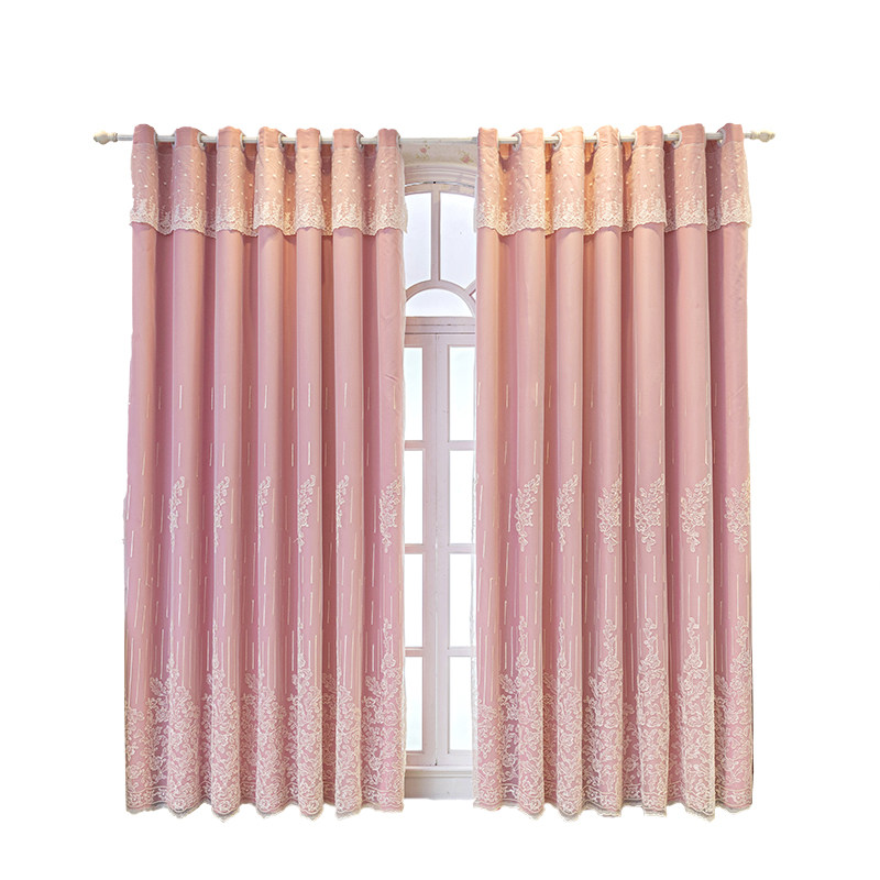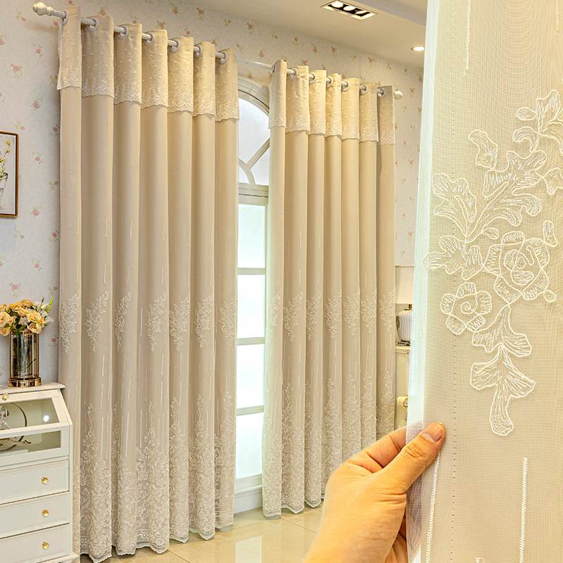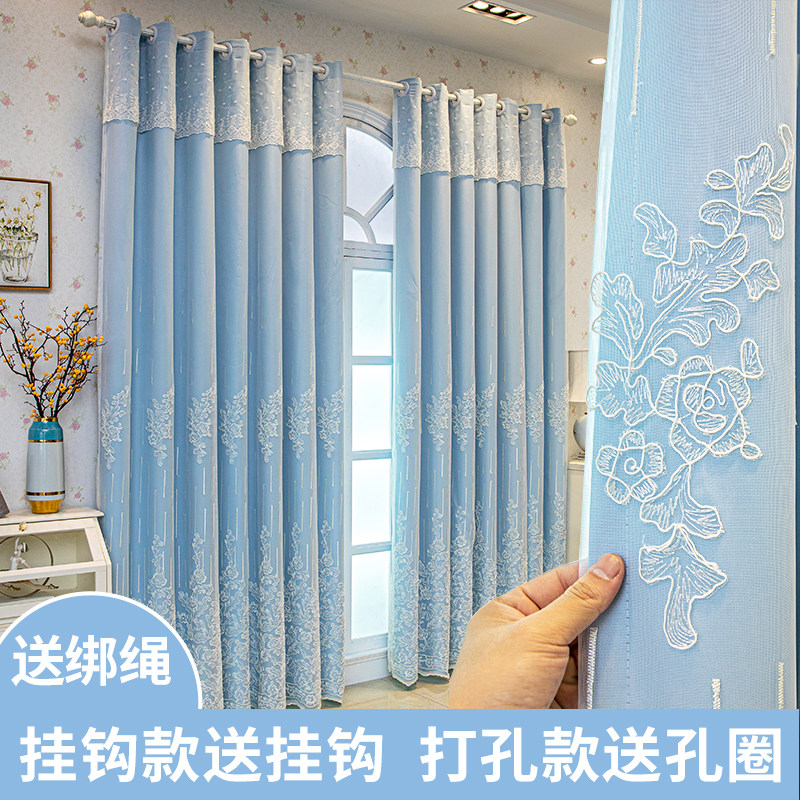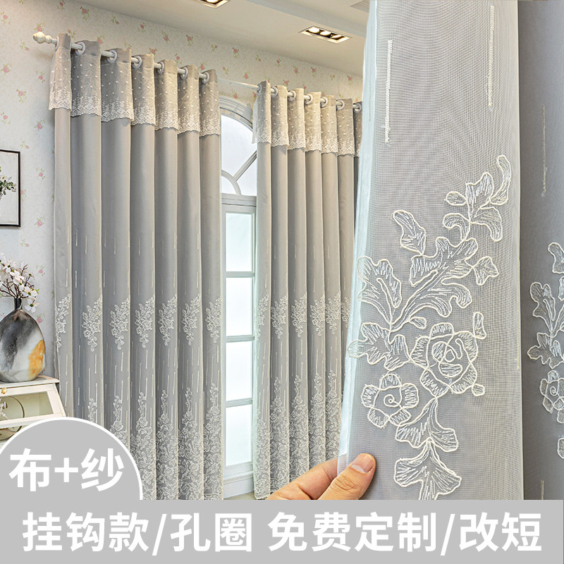 新款 窗帘遮光布纱一体双层飘窗客厅卧室纯色田园简约现代绣花纱帘