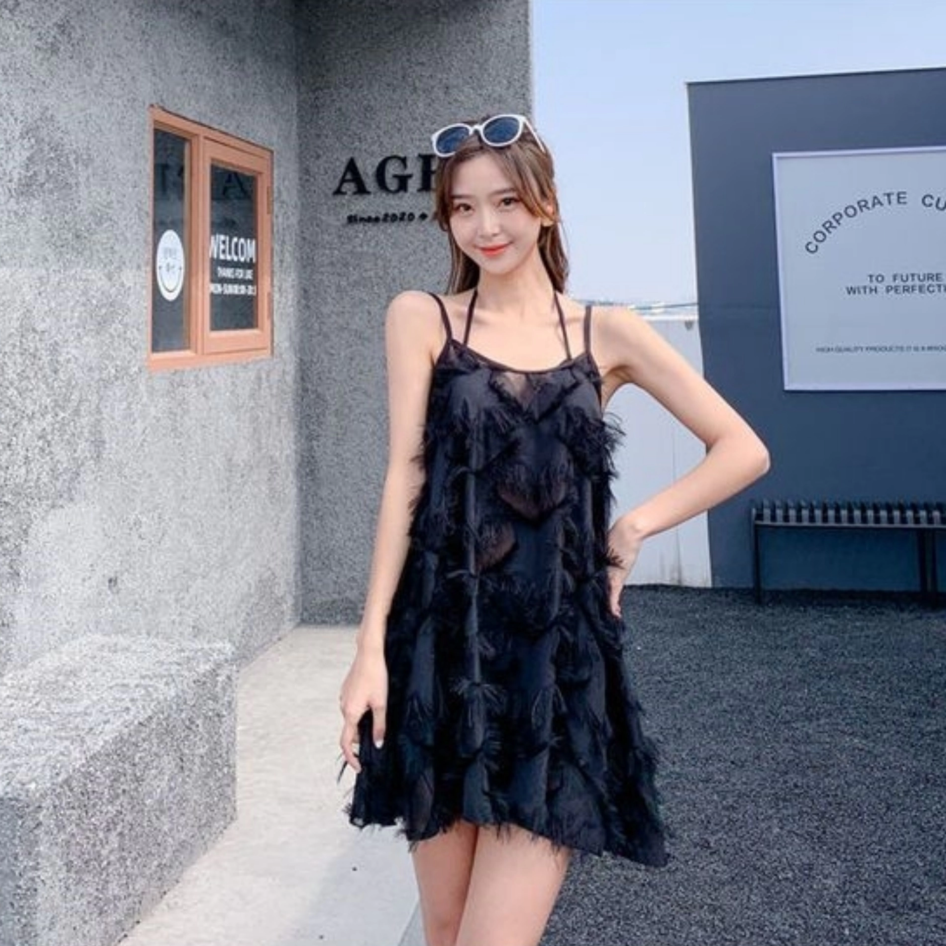 赵露思同款 绝美温泉泳衣女斜肩显瘦曜石黑纯欲高级感连体泳衣