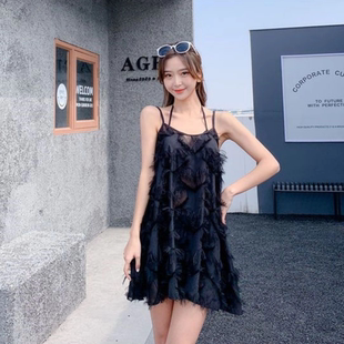 游泳衣女2025黑色露背高级感荷叶边连体裙式 小胸显瘦遮肚温泉泳装