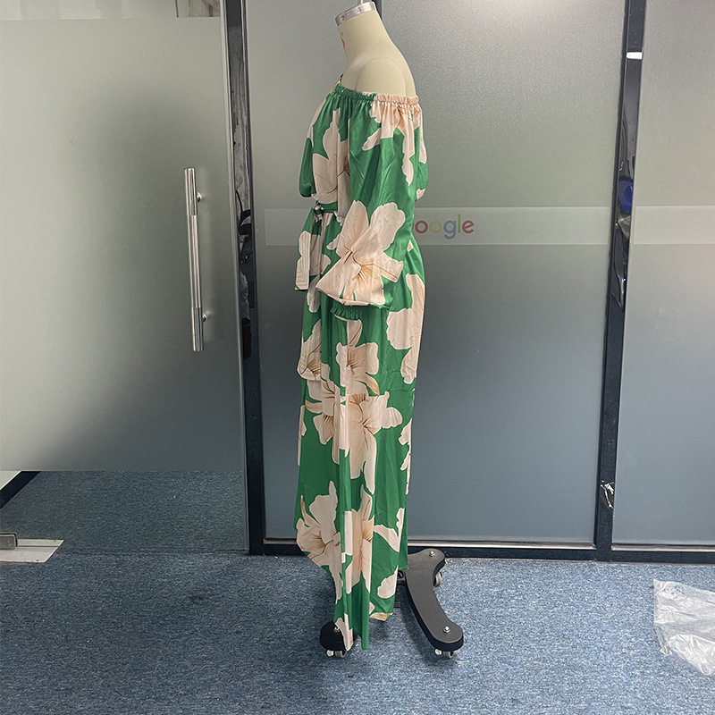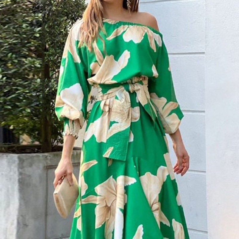 Sleeve Long Printed Dress 印花长裙 Oblique 斜领长袖 Neck