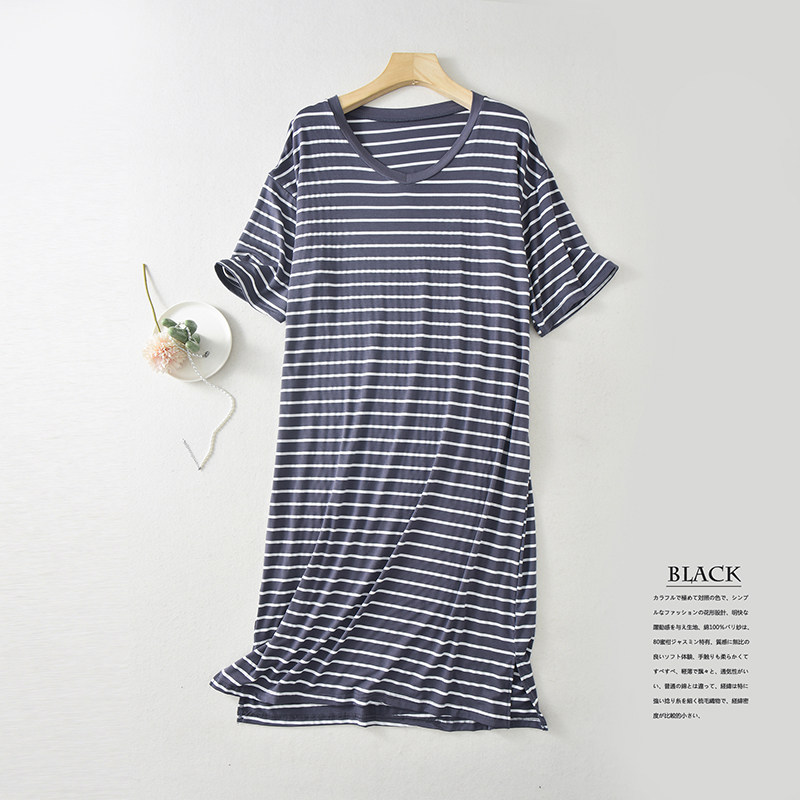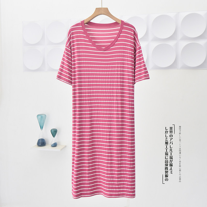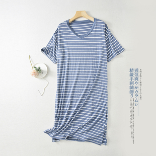 家居服睡裙宽松大码 莫代尔条纹连衣裙女短袖 睡衣百搭长裙 薄款 夏季