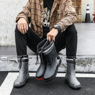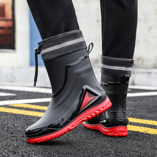 户外防滑收口雨靴加绒棉保暖水靴工作胶鞋 雨鞋 男短中筒加厚防水鞋