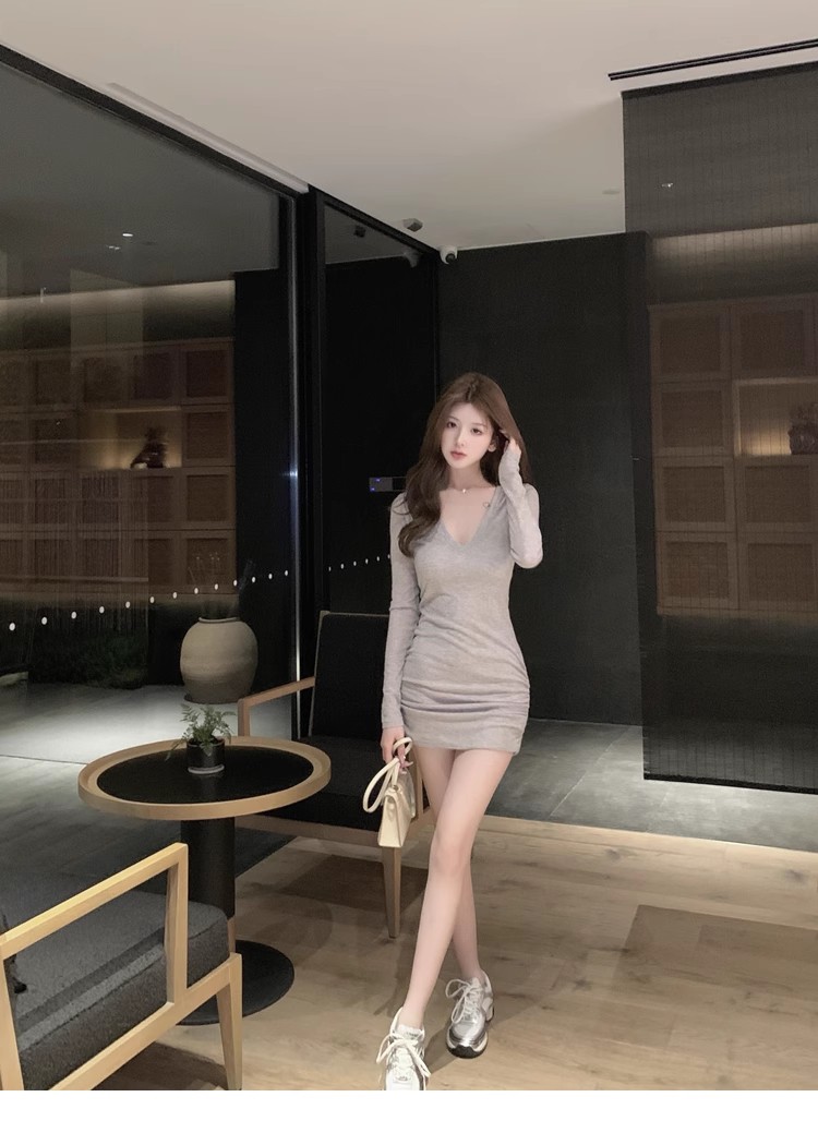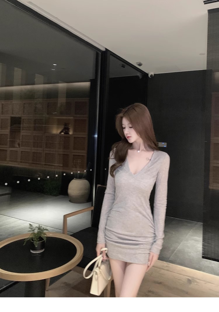 修身 百搭纯色辣妹V领薄款 收腰性感包臀打底连衣裙女 时尚 秋冬新款