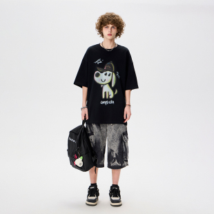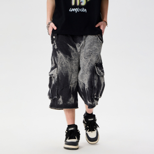 复古七分裤 LAMLICKA渐变扎染黑色牛仔短裤 阔腿美式 宽松工装 男夏季