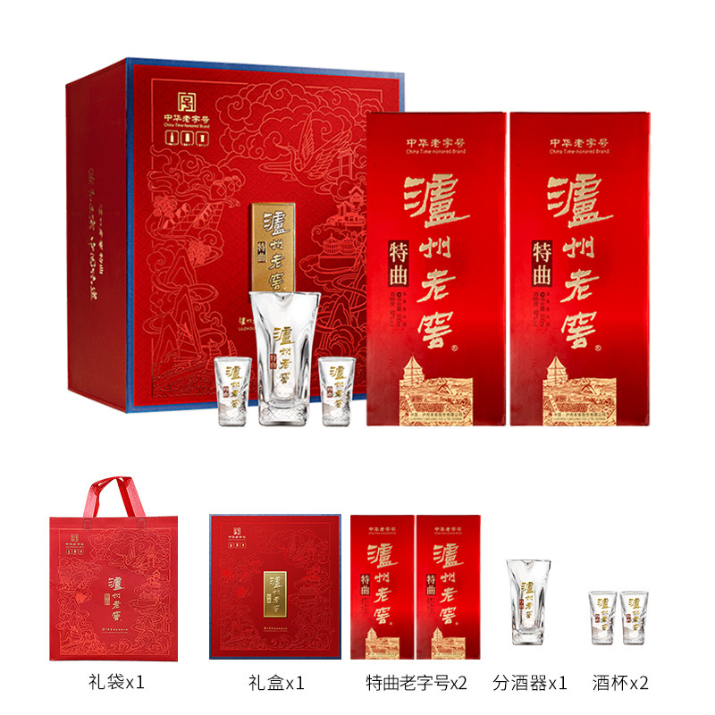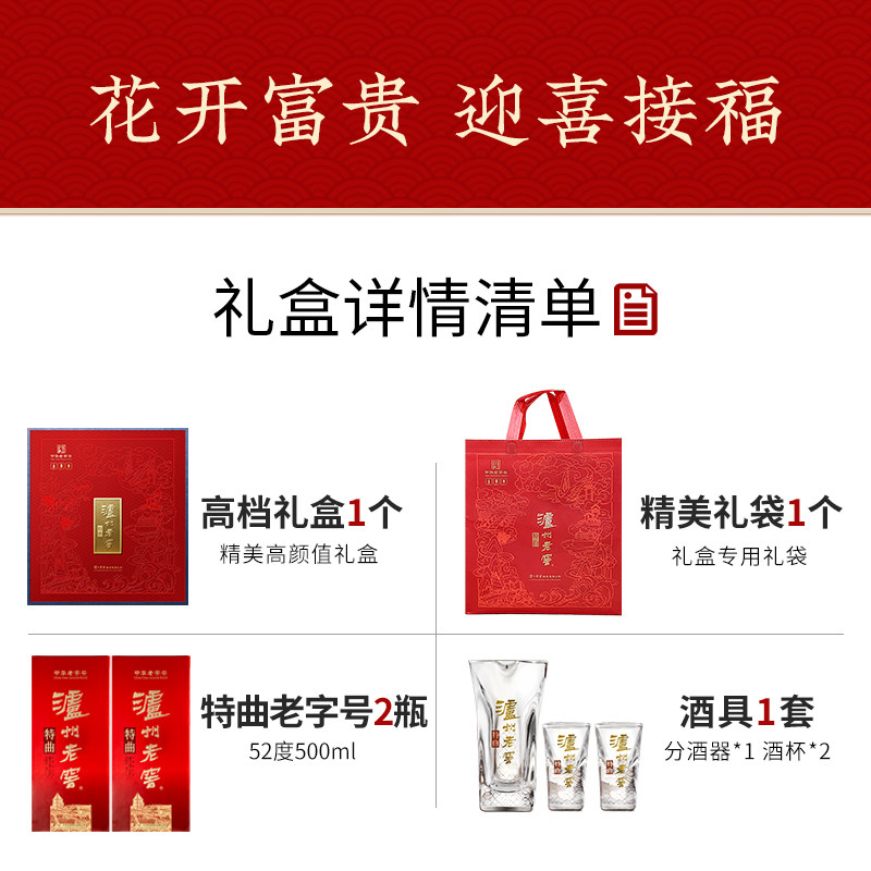 2瓶 泸州老窖特曲花开富贵礼盒52度500ml 精美酒具 官方正品