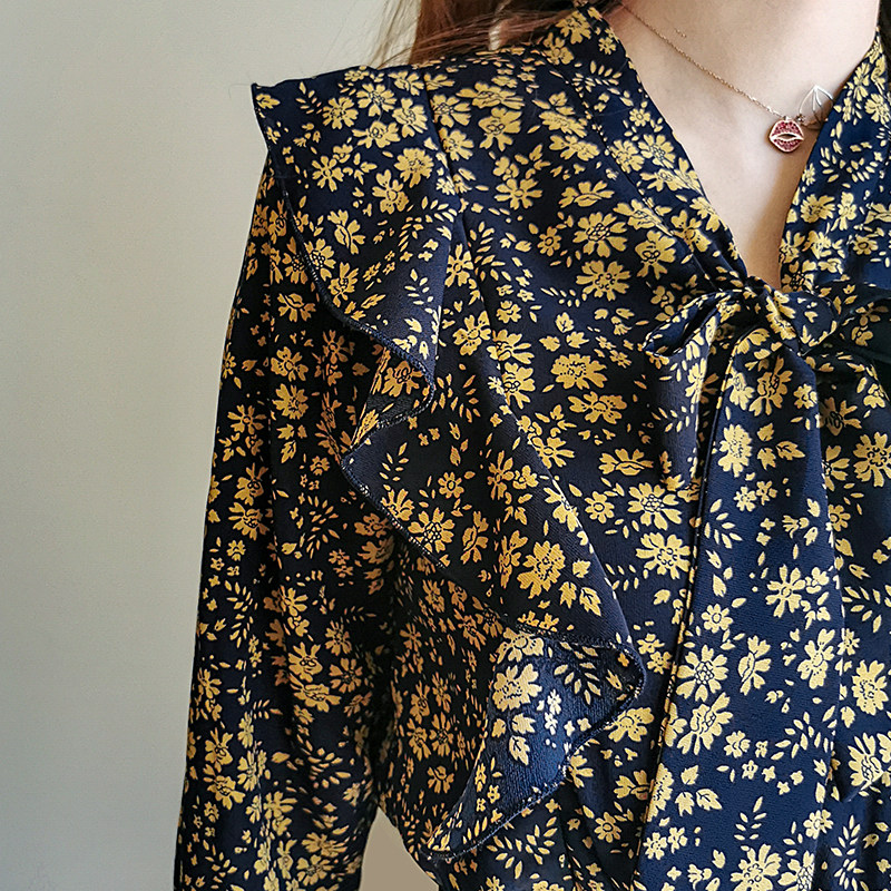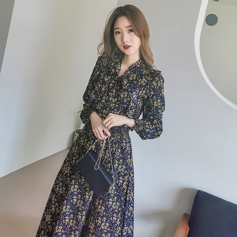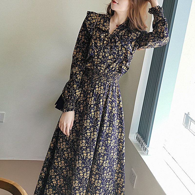 女装 碎花雪纺连衣裙女2025过膝裙子收腰显瘦气质森系长袖 春秋韩版