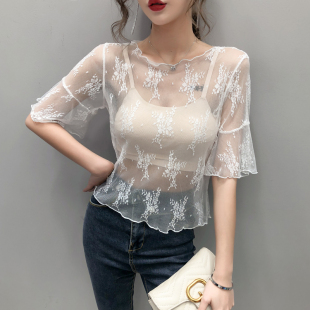 薄纱内搭纱衣仙气镂空网纱上衣 t恤女2020款 透视蕾丝打底衫 女短袖