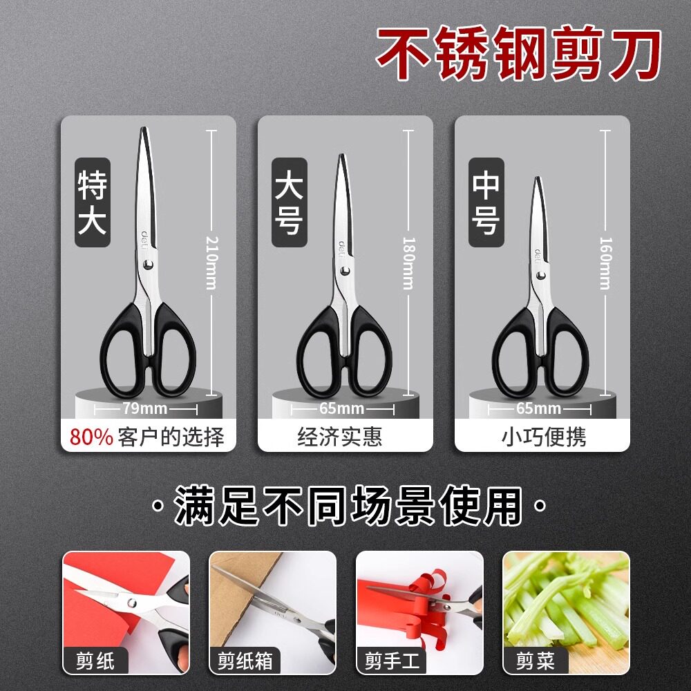 得力6009学生手工剪纸刀便捷式 办公用品不锈钢美工无尖圆头大号中号小号剪刀家用厨房裁缝多功能拆快递剪刀
