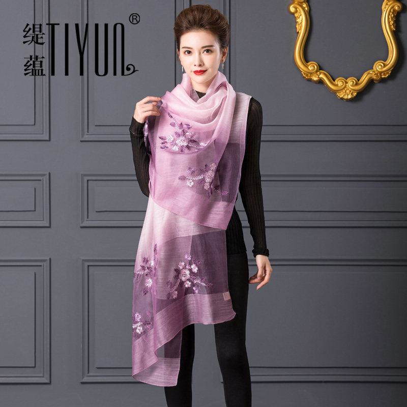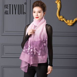春秋桑蚕丝刺绣披肩薄 渐变真丝丝巾妈妈款 羊毛围巾女冬季 百搭长款