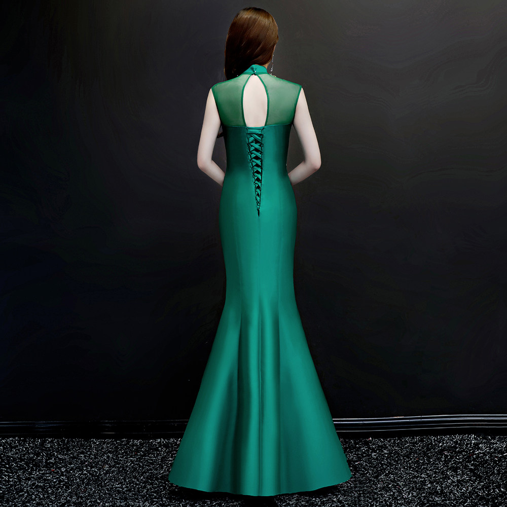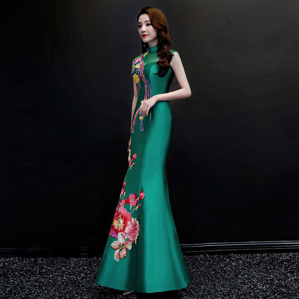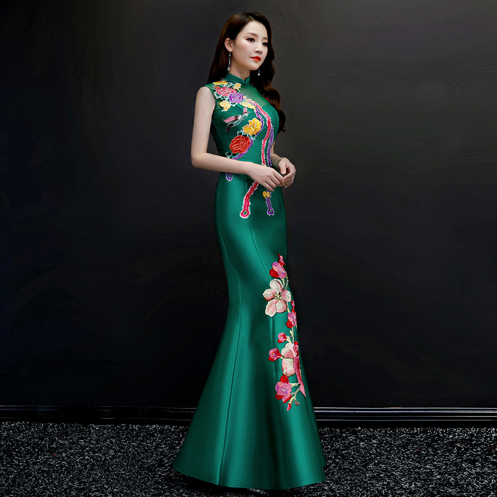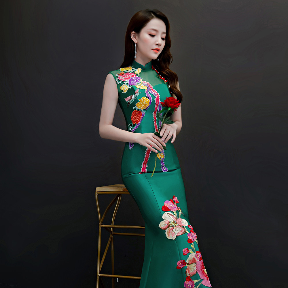 紫缘萱中国风宴会晚礼服绿色刺绣鱼尾旗袍模特走秀团队演出服修身