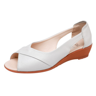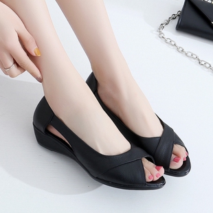 凉鞋 新款 女夏罗马真皮软底坡跟中跟休闲舒适鱼嘴鞋 女鞋 大码 妈妈鞋