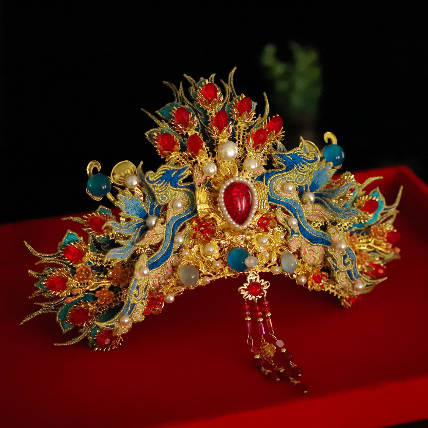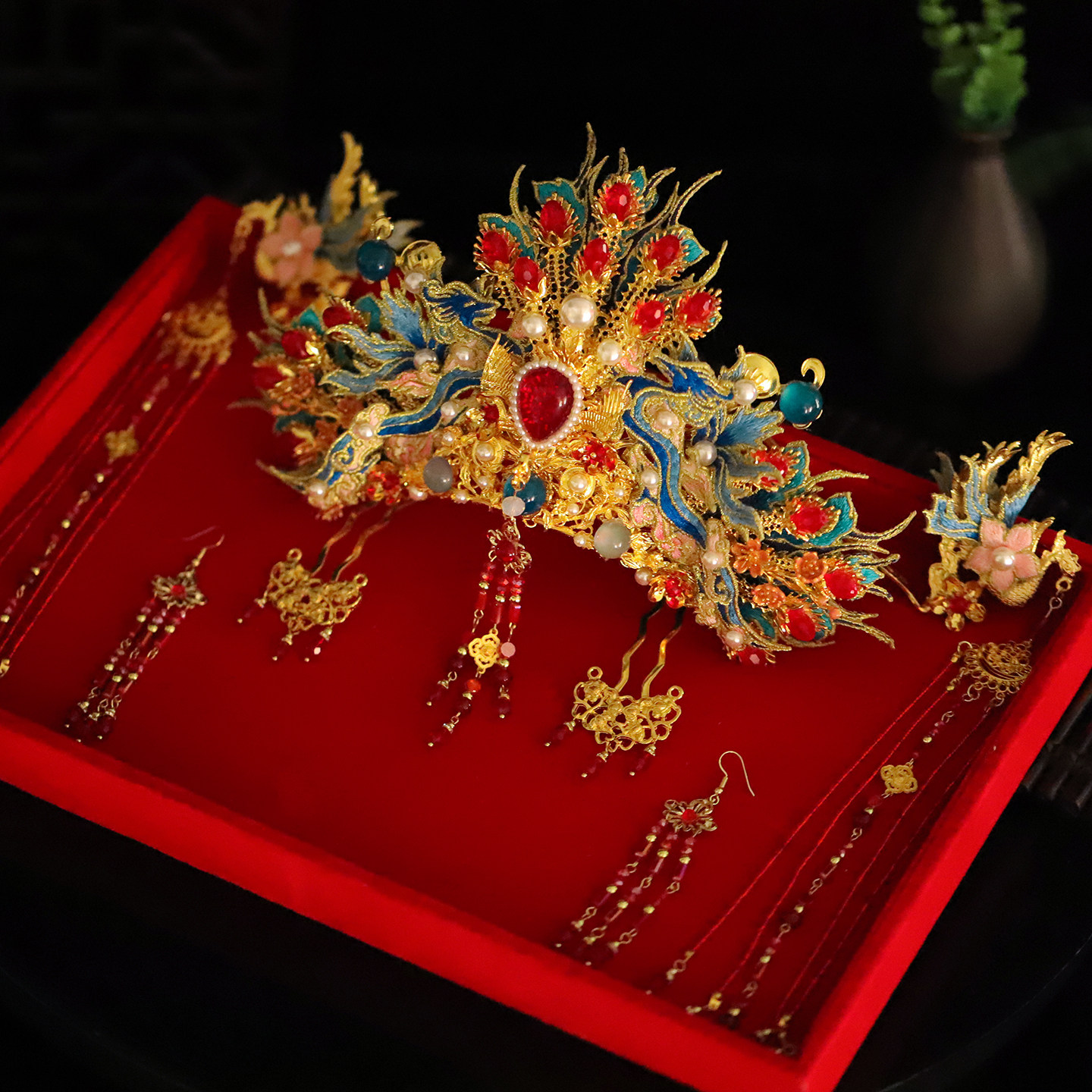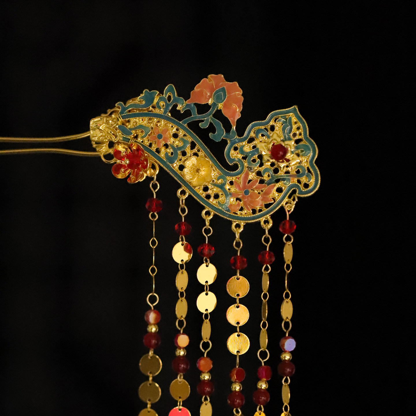 复古植绒红扇子发夹新中式 流苏侧边刘海夹前额碎发卡国风新年发饰