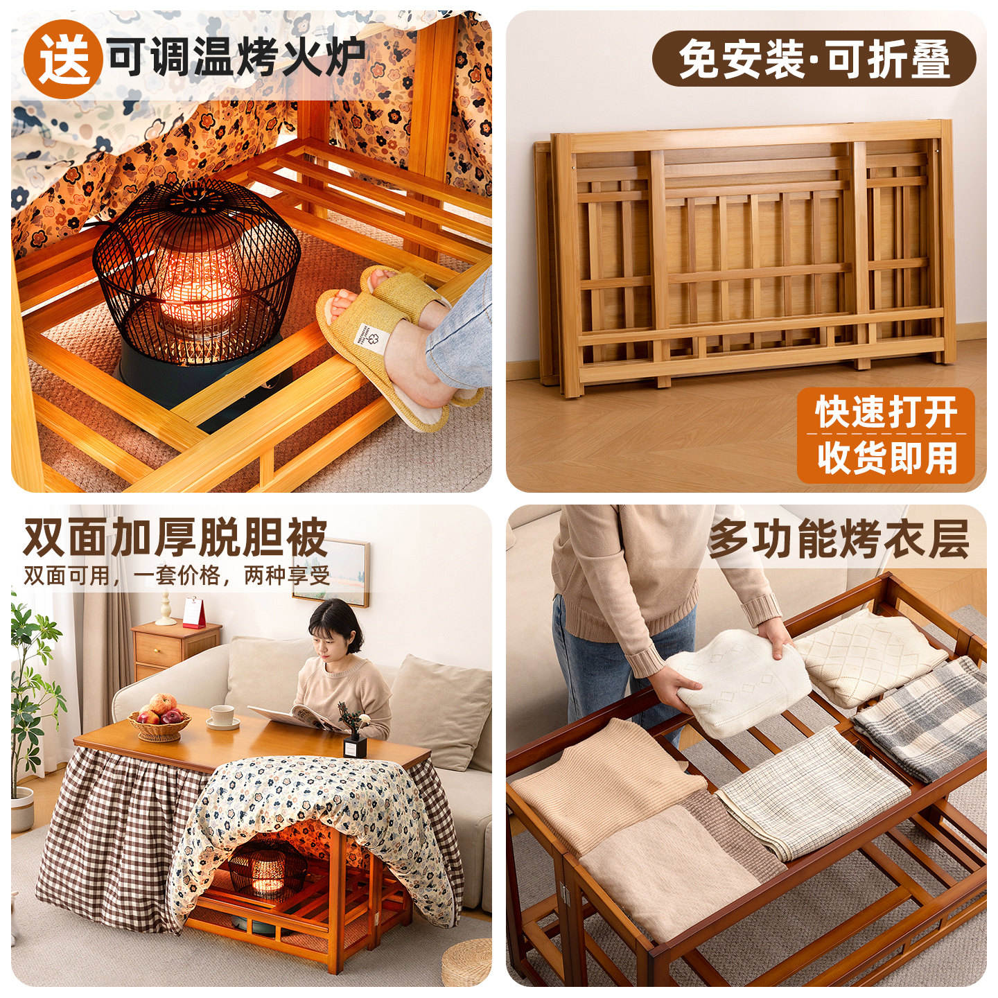 烤火桌子家用冬季 多功能取暖烤火架实木楠竹可折叠桌正长方形湖南