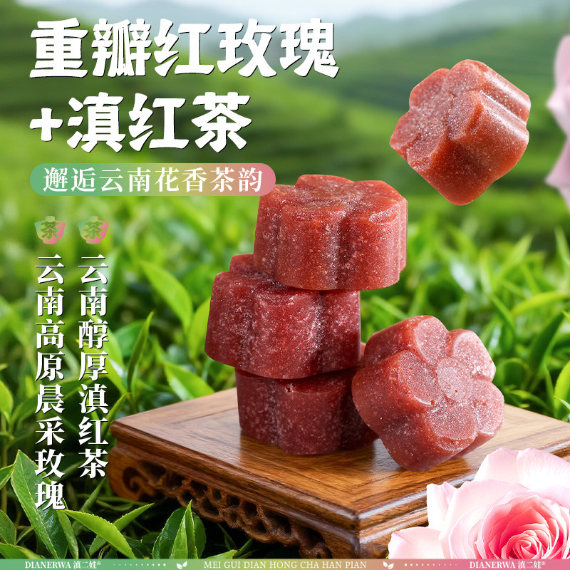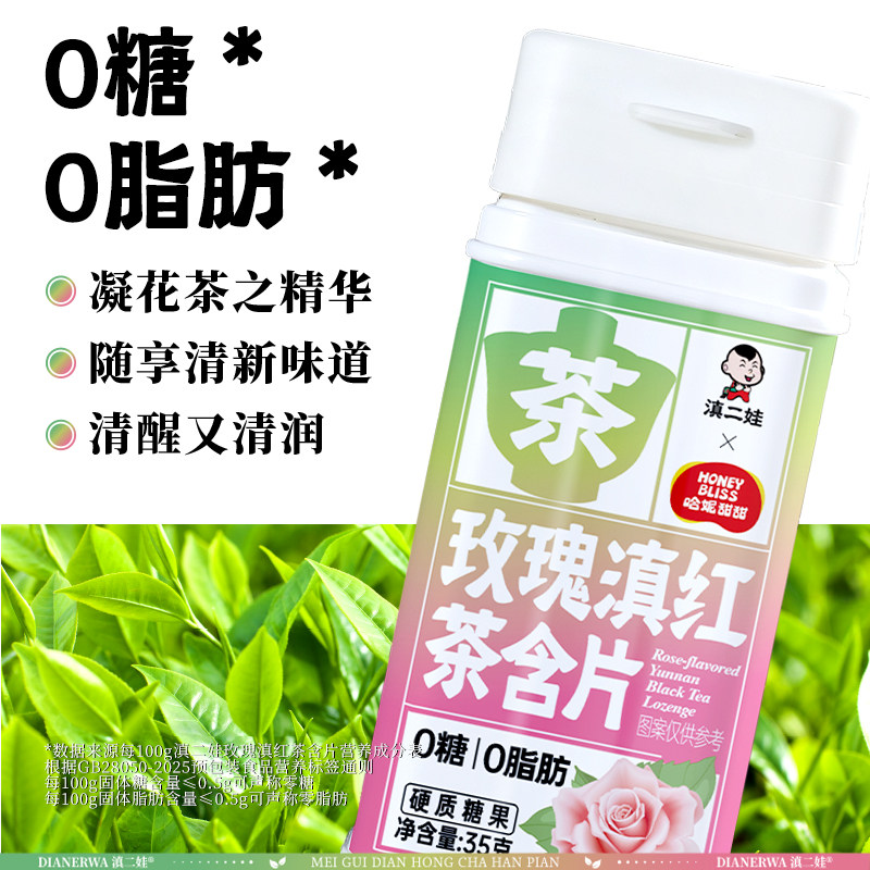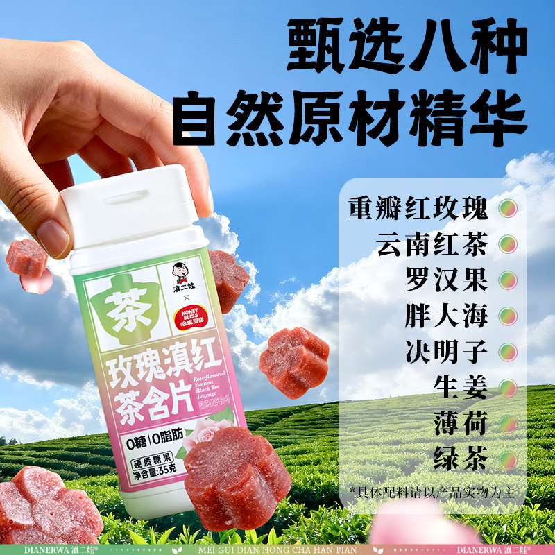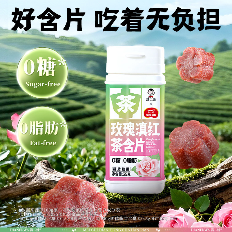 滇二娃玫瑰滇红茶糖含片0糖0脂肪清新口气润喉糖果硬糖小零食瓶装