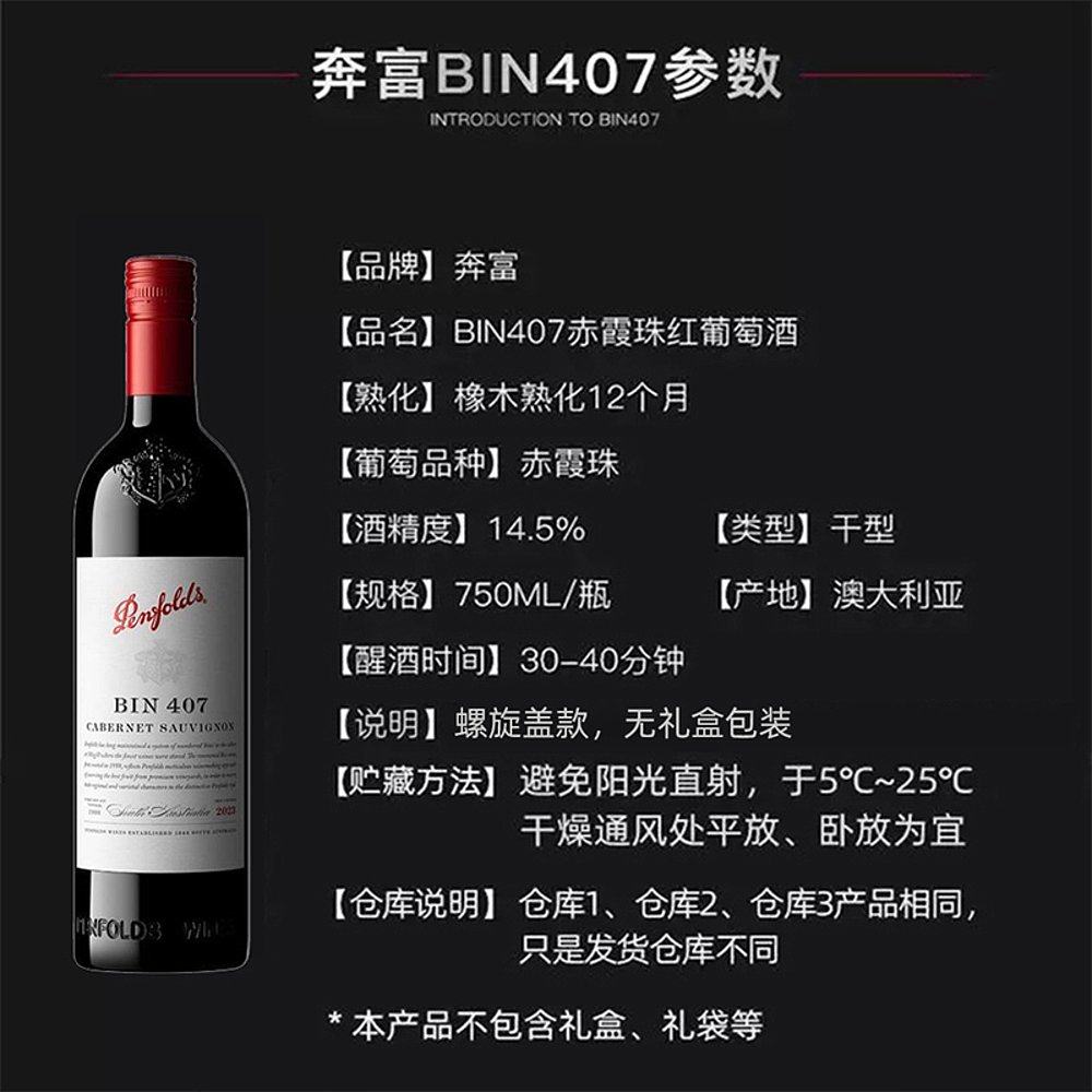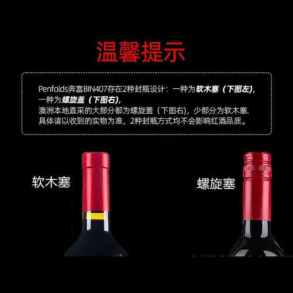 奔富 750ml 红酒407 2023年 螺旋 赤霞珠 澳大利亚直邮Penfolds