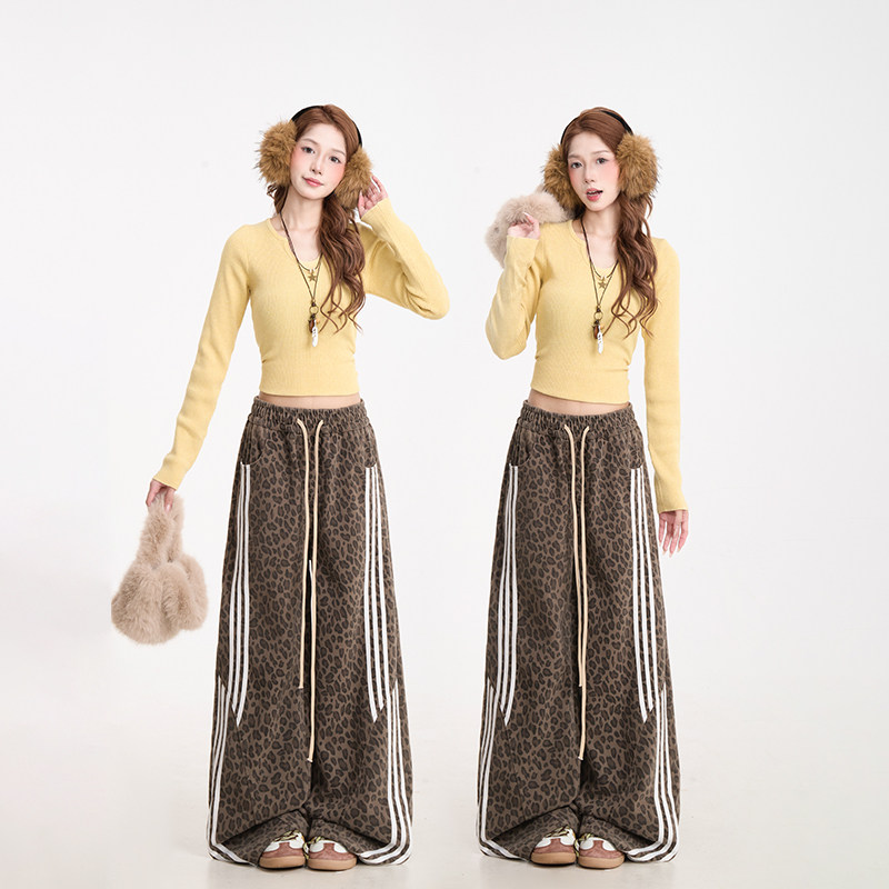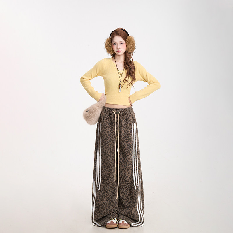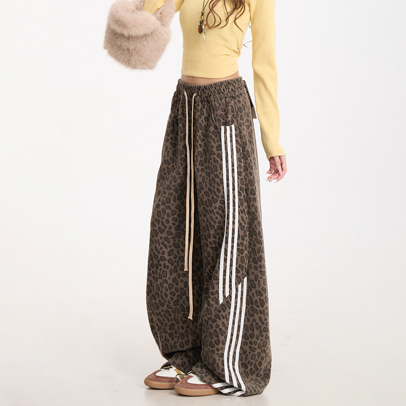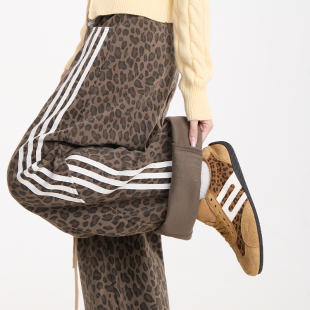 秋冬加绒直筒休闲裤 复古阔腿裤 子女三条杠拼接美式 NERESUM豹纹裤
