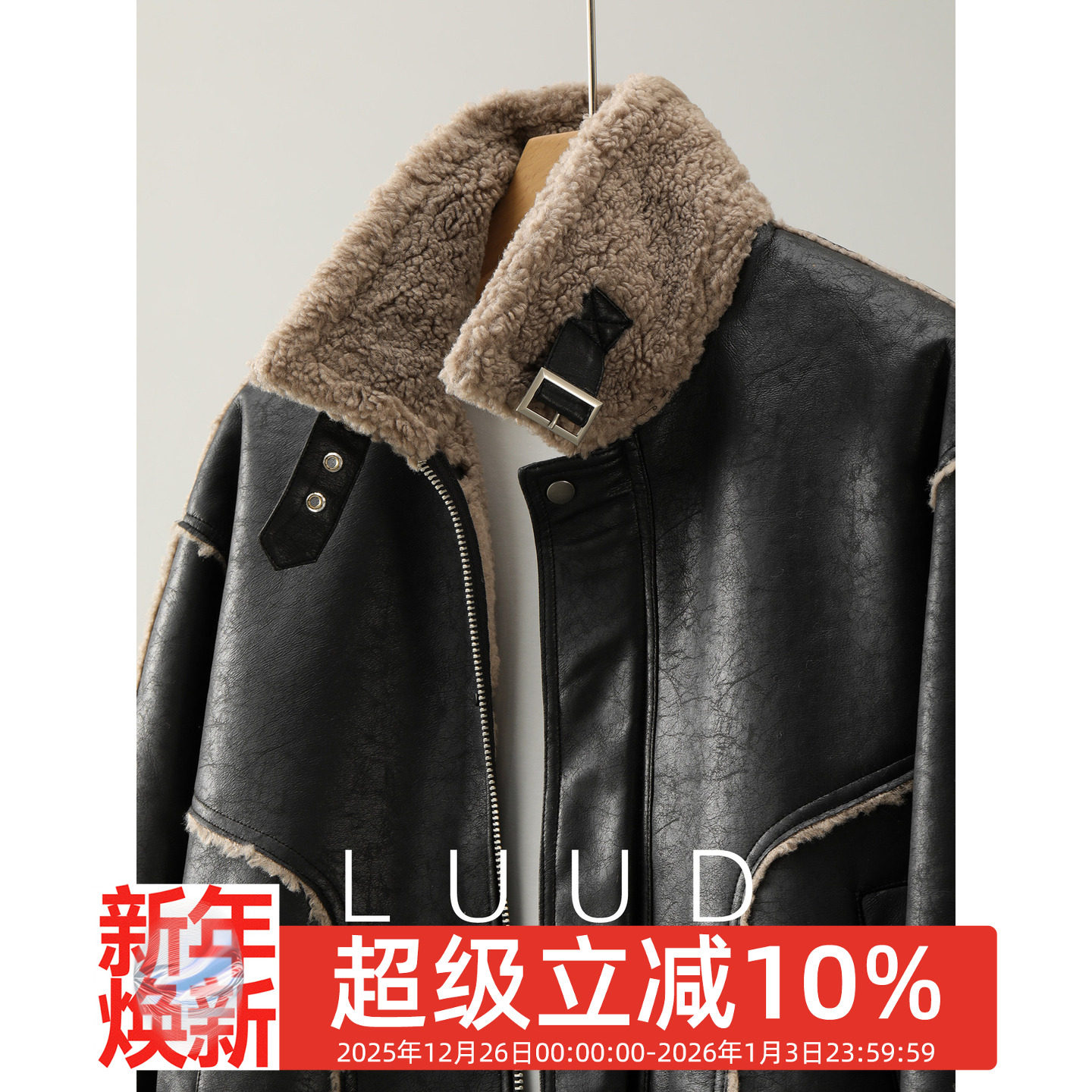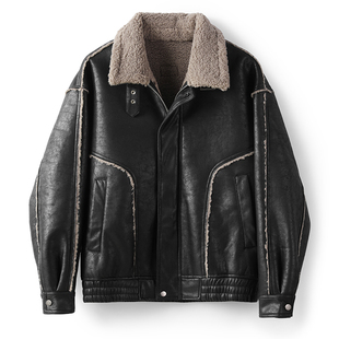 三福2025冬季 字母刺绣PU皮衣夹克复古宽松翻领加绒外套男506290
