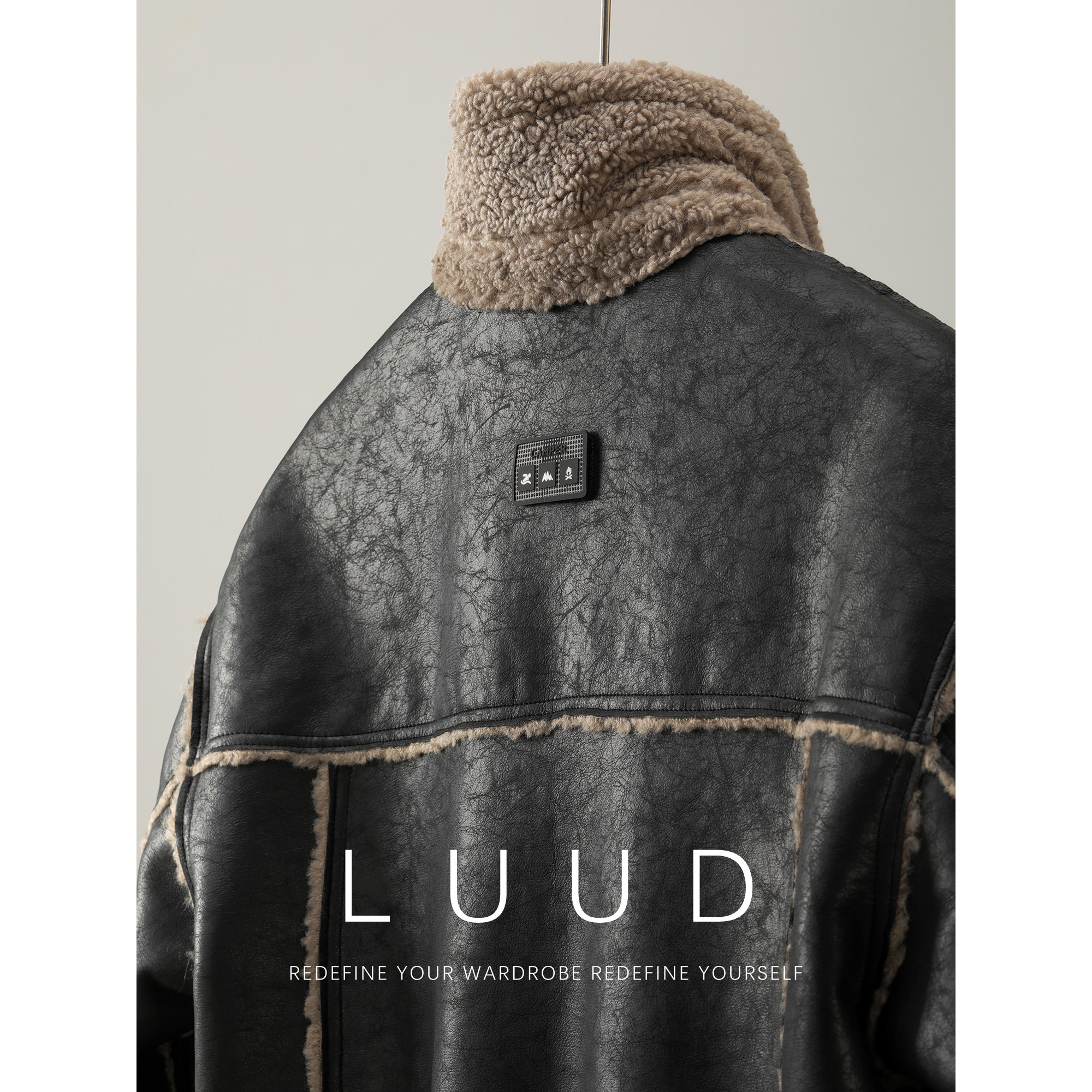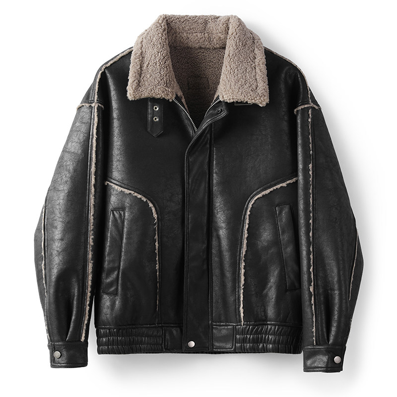 三福2025冬季 蜡染PU皮衣夹克男加绒复古大口袋宽松外套510052 满版