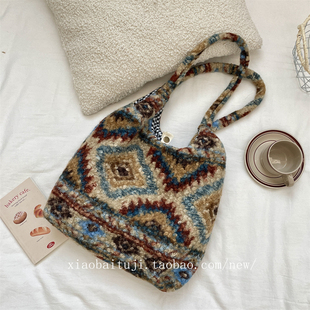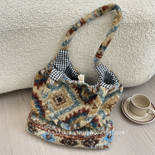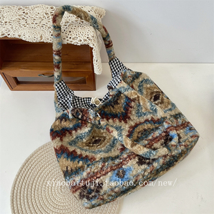 小白兔几 复古格子毛绒简约单肩学生大容量通勤背心包手提帆布包
