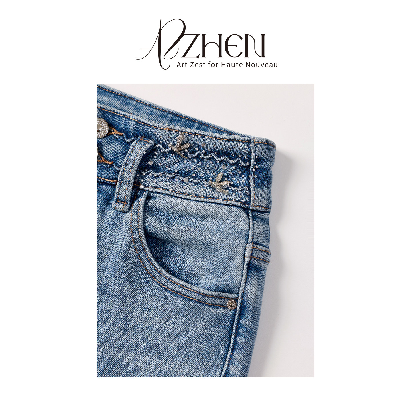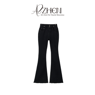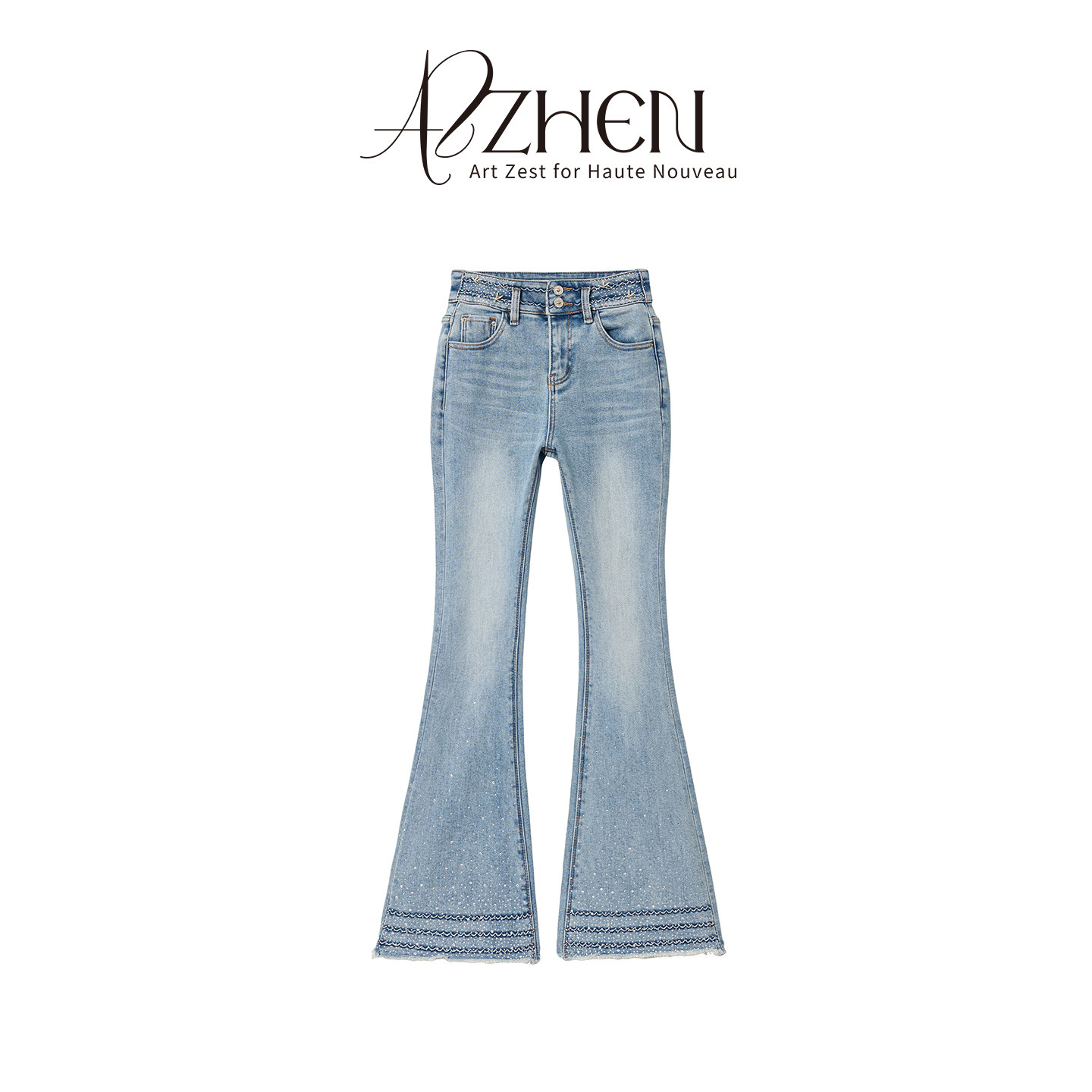 显瘦弹力喇叭长裤 AZZHEN 女修身 高腰微喇牛仔裤 蓝色 翘臀因子