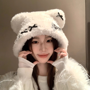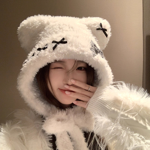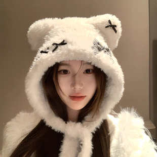 加厚头套保暖护耳帽围脖毛绒帽 新款 可爱小熊帽子围巾一体女款 冬季