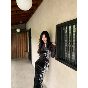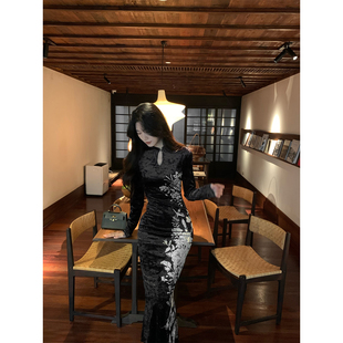 旗袍礼服 性感气质修身 Norain不下雨黑色丝绒长袖 连衣裙女秋冬新款