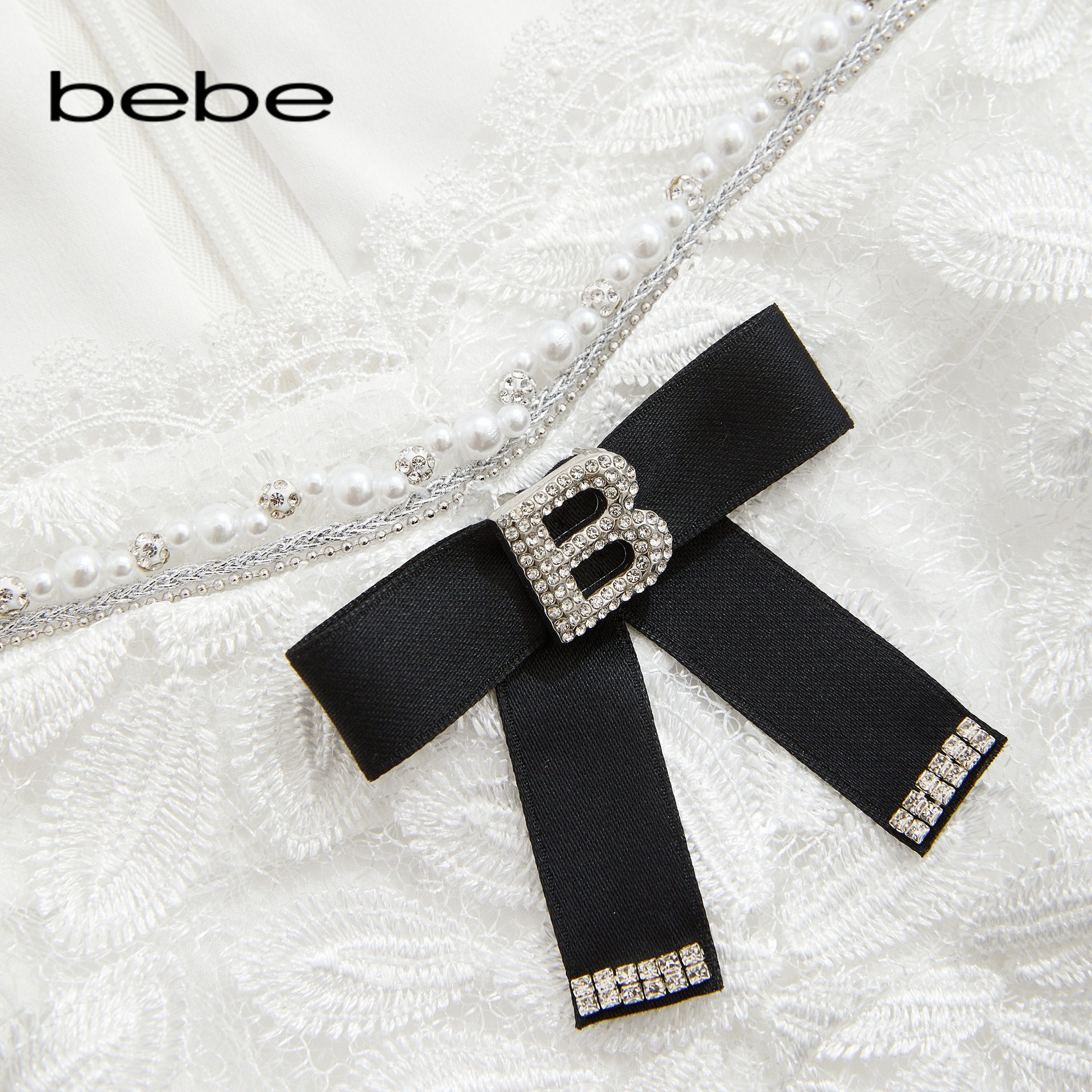 bebe2025秋冬新款 饰连衣裙350030 女士气质风蕾丝花边蝴蝶结装