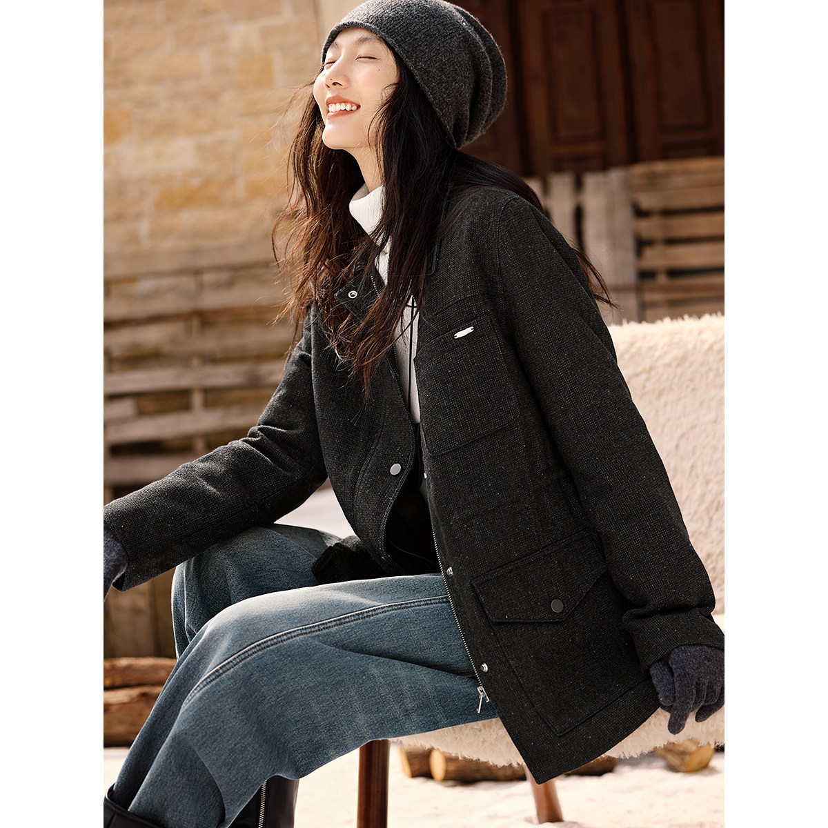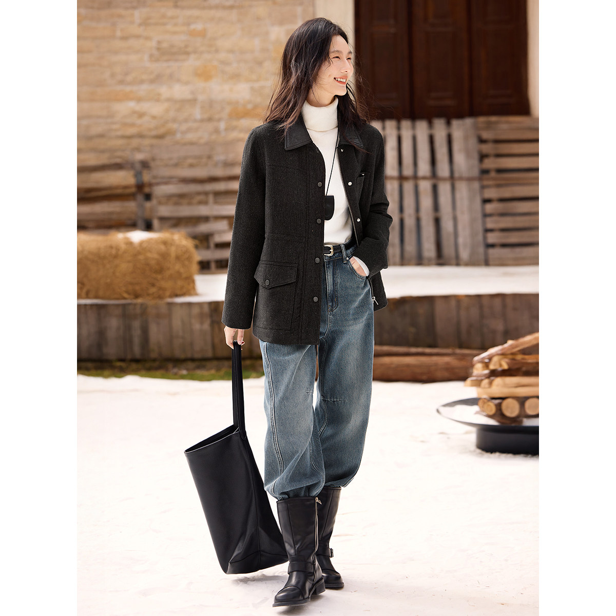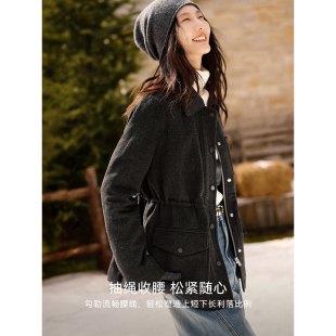 XWI欣未巴恩风含羊毛翻领大衣女2025冬季 收腰显瘦设计感毛呢外套