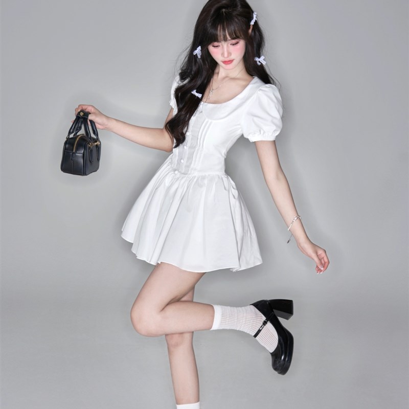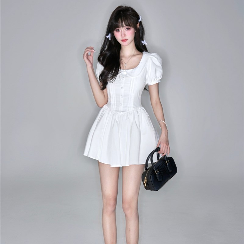 温柔淑女娃娃领收腰连衣裙 清纯少女甜美白色法式 越韩小鱼 青梅果