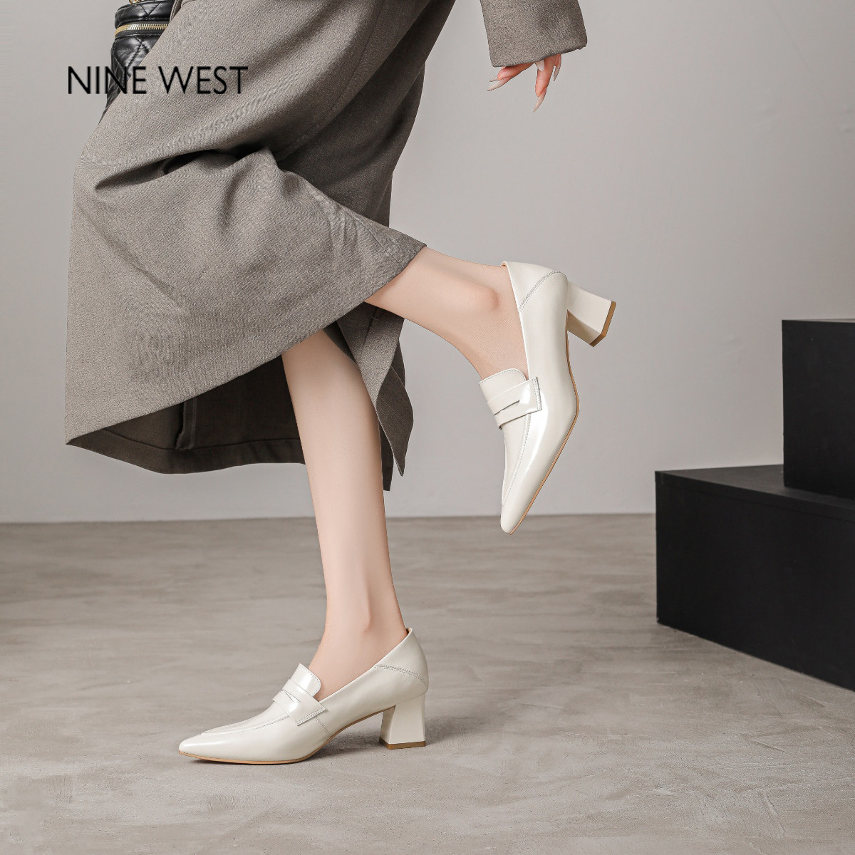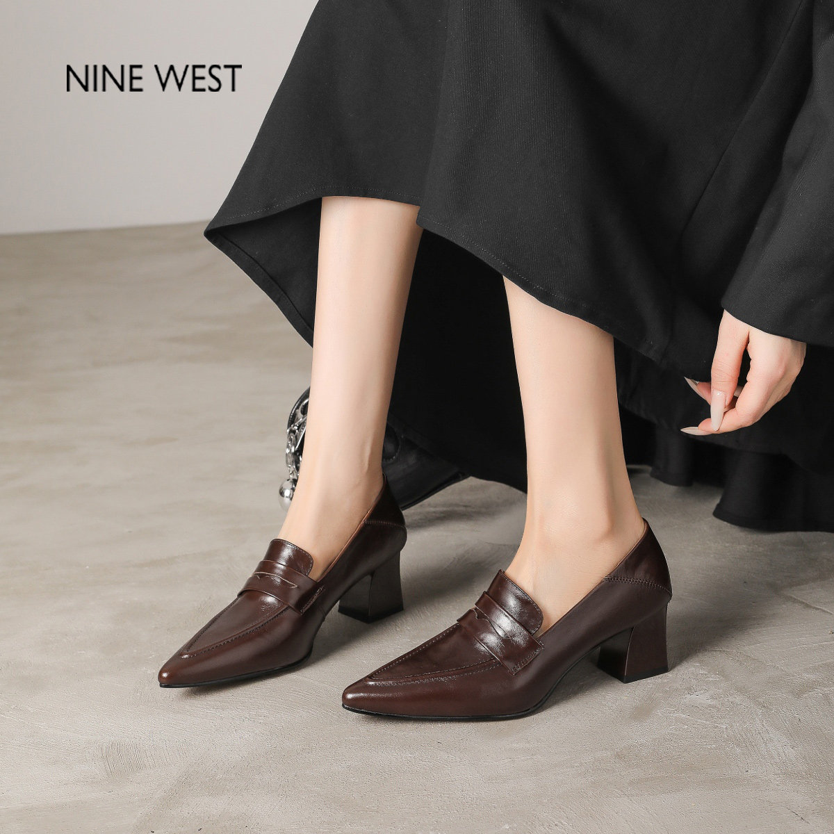 West 女鞋 玖熙复古尖头乐福鞋 粗高跟单鞋 气质小皮鞋 奥莱专供Nine