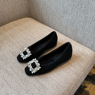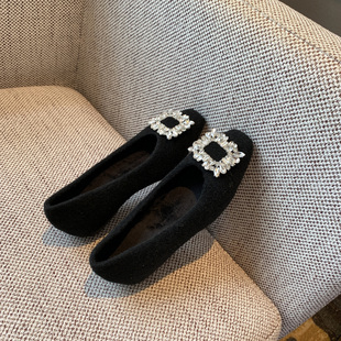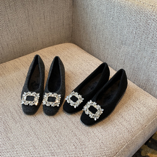 毛毛鞋 43码 女浅口大码 厚底加绒加厚单鞋 平底 水钻外穿豆豆鞋 棉瓢鞋