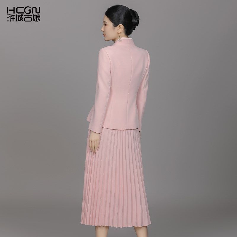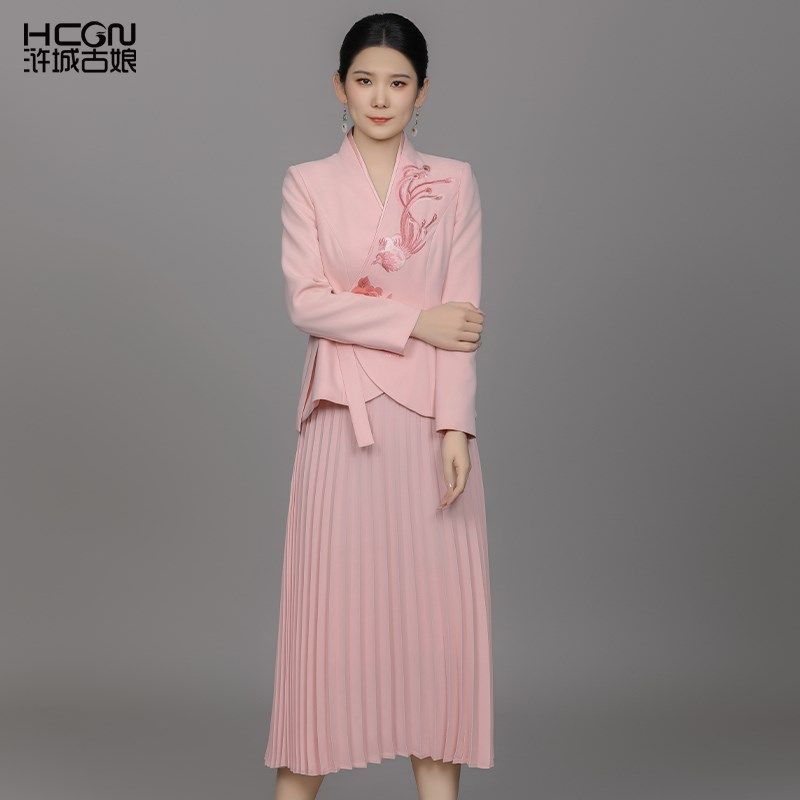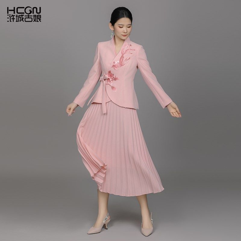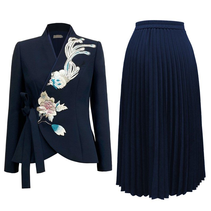 中国风精致刺绣V领凤牡丹职业搭配百褶西服半裙减龄清新气质套裙