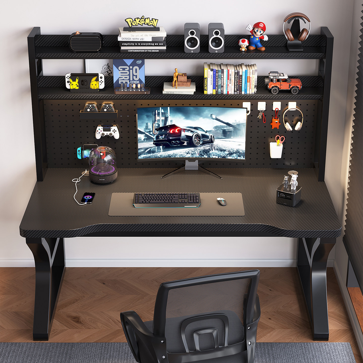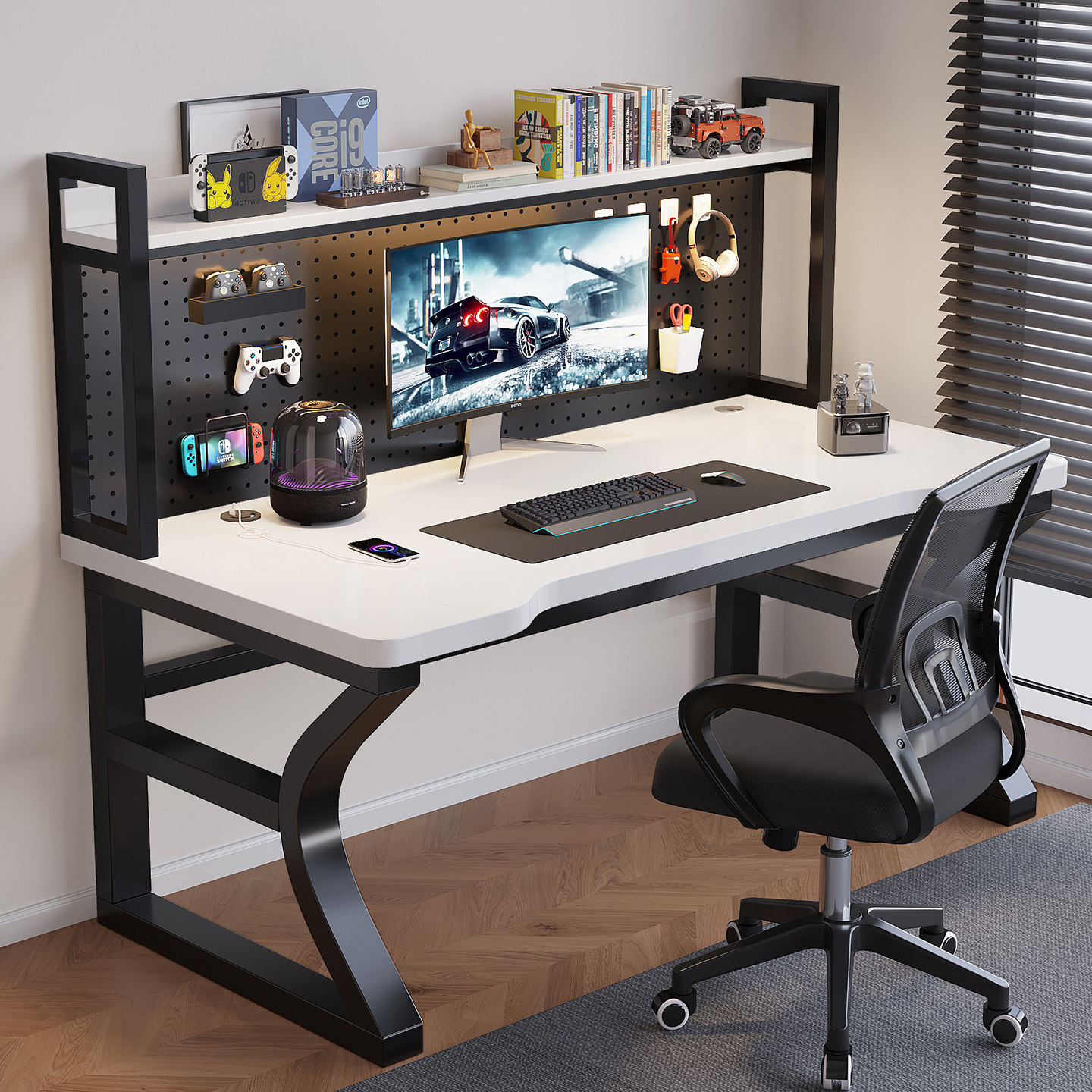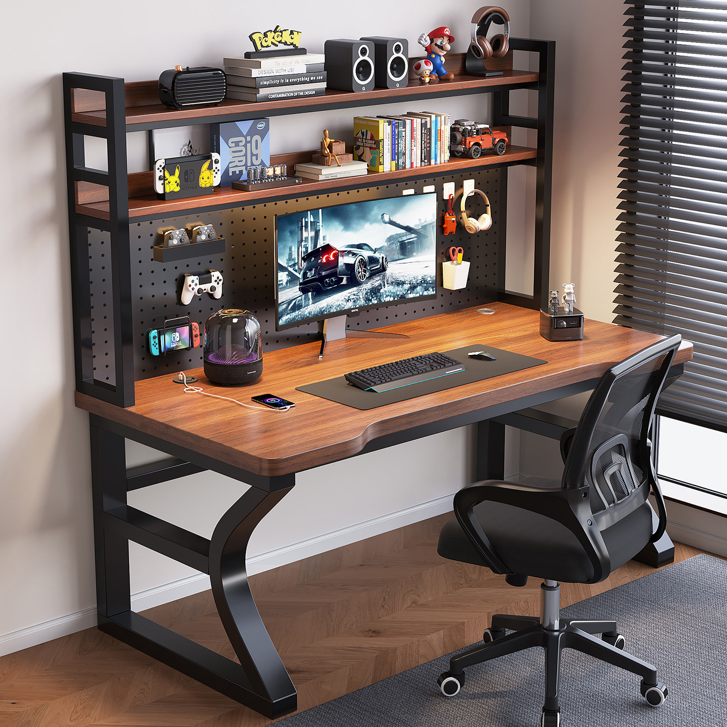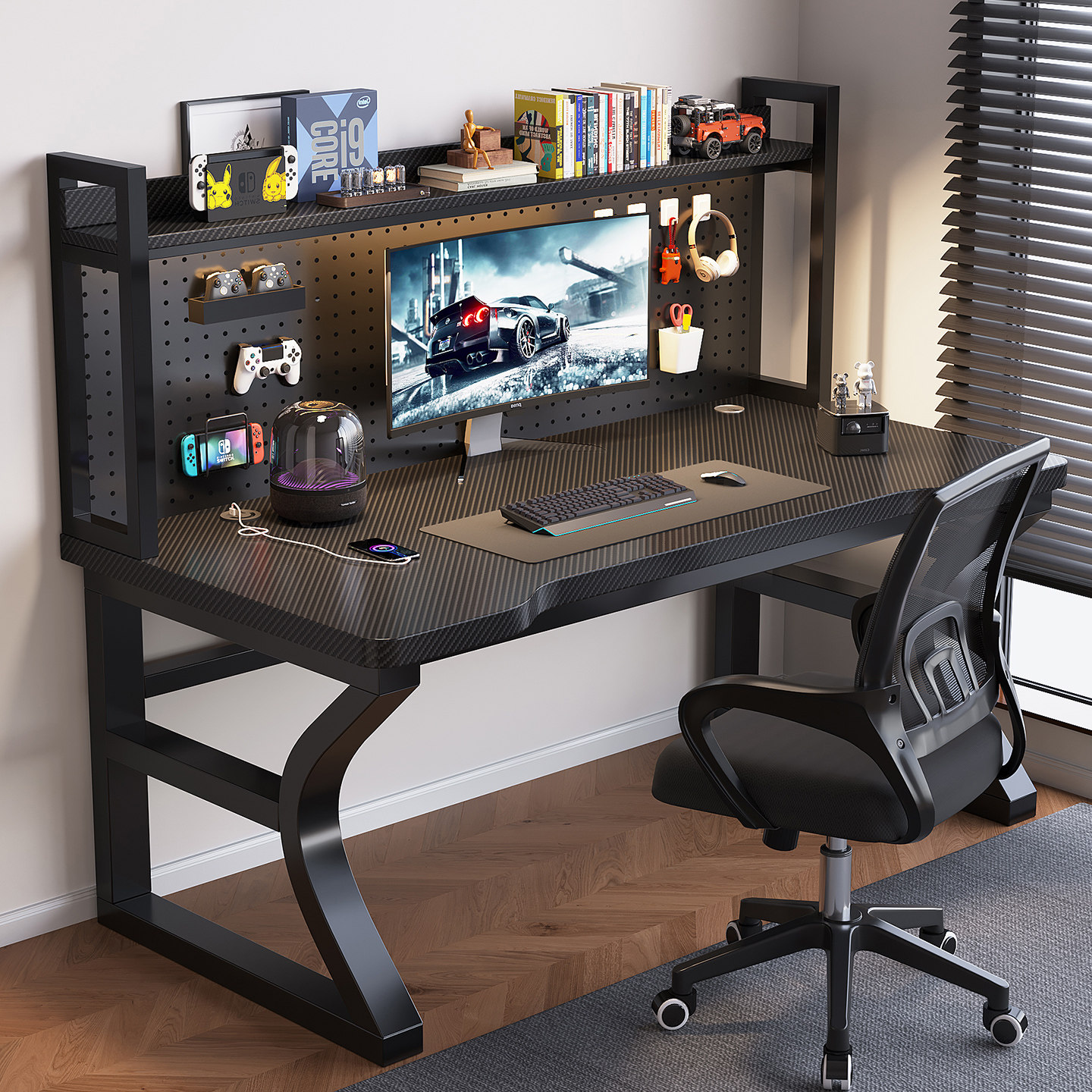 实木电脑桌家用台式 学习桌碳纤维洞洞板书桌书架一体电竞办公桌子