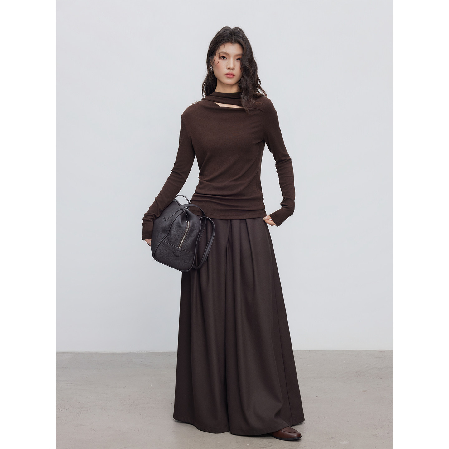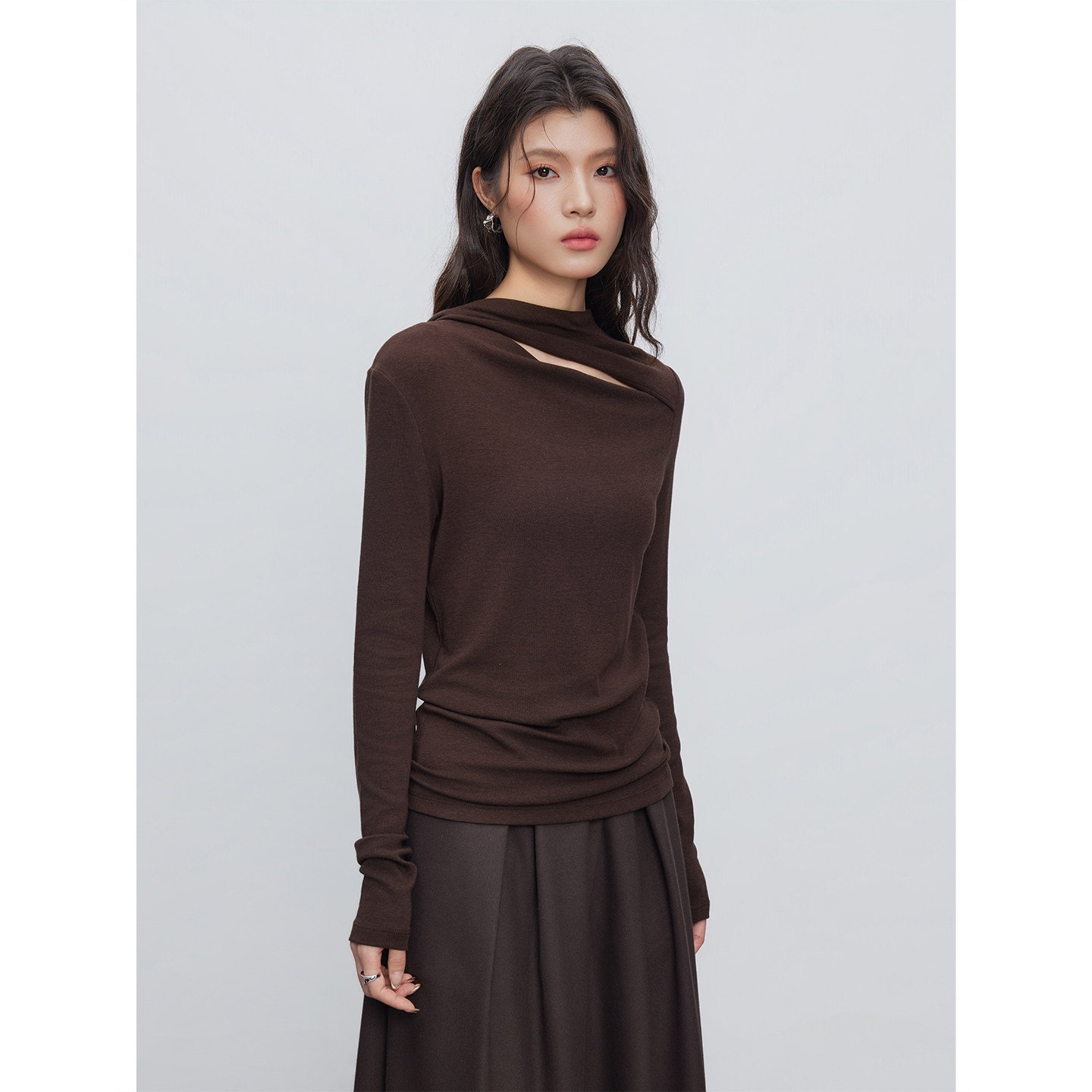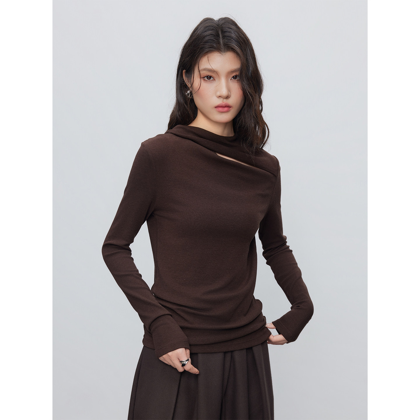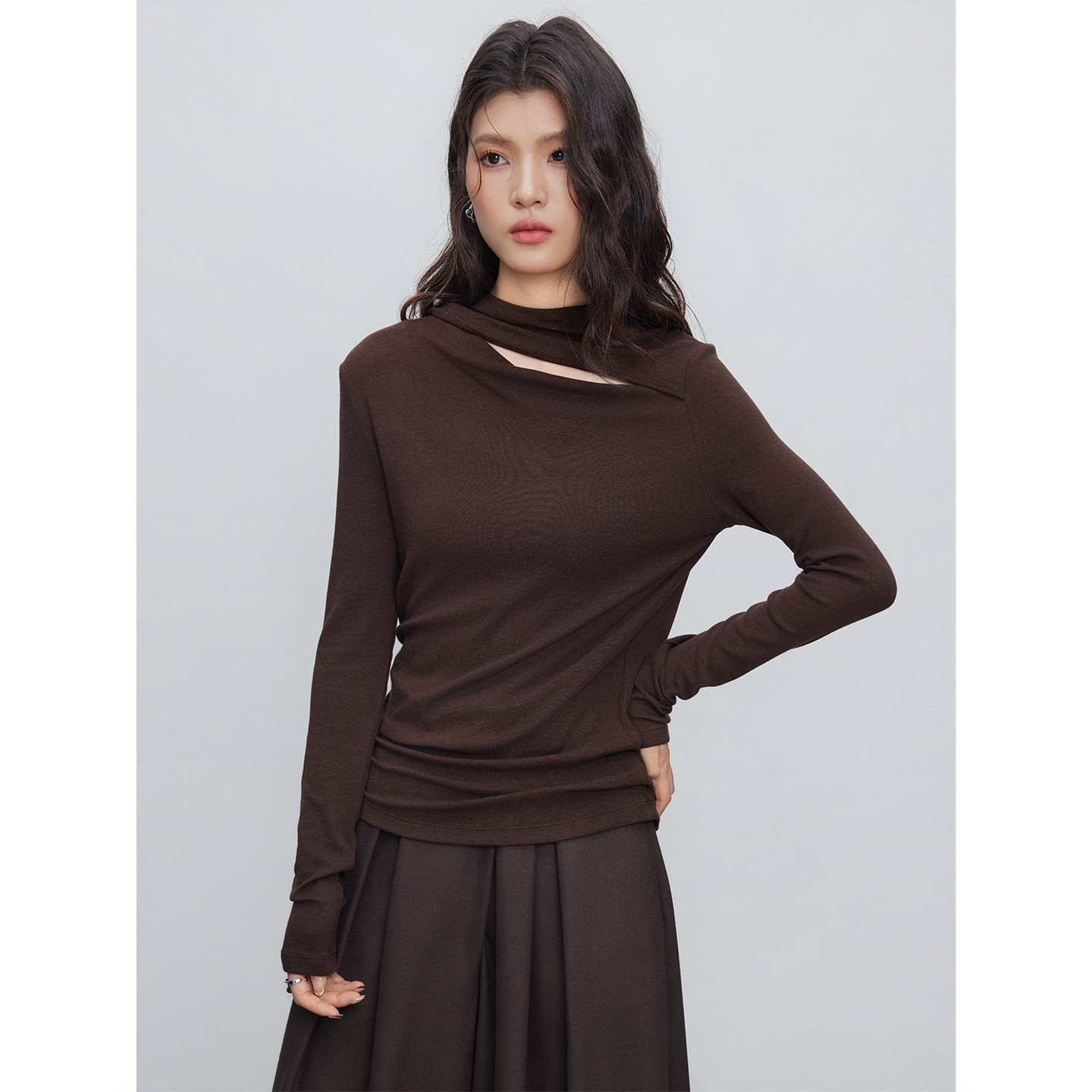 长袖 女新款 内搭T恤休闲 韩系氛围感不规则设计感咖色打底衫 KEARA